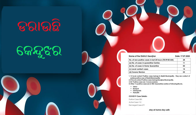 କେନ୍ଦୁଝର,୧୭।୭(ସ୍ବ.ପ୍ର.): କେନ୍ଦୁଝର ଜିଲାରେ ଶୁକ୍ରବାର ୨୮ କରୋନା ପଜିଟିଭ ଚିହ୍ନଟ ହୋଇଛନ୍ତି। ସେମାନଙ୍କ ମଧ୍ୟରୁ ୧୧ ଜଣ କ୍ୱାରାଣ୍ଟଇନ ସେଣ୍ଟରରୁ ଚିହ୍ନଟ ହୋଇଥିବା ବେଳେ ୩ କରୋନା ଯୋଦ୍ଧା ଅଛନ୍ତି। ଅବଶିଷ୍ଟ ୧୪ ଜଣ ପୂର୍ବରୁ କରନା ସଂକ୍ରମିତଙ୍କ ସଂସ୍ପର୍ଶରେରେ ଆସିଥିବା ସ୍ଥାନୀୟ ଅଞ୍ଚଳର। ସେଥିରୁ ୧୩ ଜଣ ବଡ଼ବିଲରେ ପୂର୍ବରୁ ସଂକ୍ରମିତ ଲୋକାଲ କଣ୍ଟାକ୍ଟ ଥିବା ବେଳେ ଜଣେ କେନ୍ଦୁଝର ସହରର ଲୋକାଲ କଣ୍ଟାକ୍ଟ ଅଛନ୍ତି। ତେଲକୋଇ, ବଂଶପାଳ, ସହରପଡ଼ା, ହାଟଡ଼ିହୀ ବ୍ଲକ ଅଞ୍ଚଳର ବିଭିନ୍ନ କ୍ୱାରାଣ୍ଟାଇନ୍ର ୧୧ ଜଣ ପ୍ରବାସୀ।
