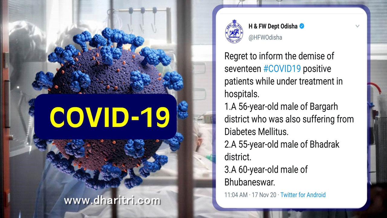 ଭୁବନେଶ୍ୱର,୧୭।୧୧(ବ୍ୟୁରୋ): ରାଜ୍ୟରେ ମଙ୍ଗଳବାର ଆଉ ୧୭ ଜଣଙ୍କ ମୁଣ୍ଡ ନେଇଛି କରୋନା। ଏହାକୁ ମିଶାଇ ରାଜ୍ୟରେ କରୋନା ଜନିତ ମୃତ୍ୟୁ ସଂଖ୍ୟା ୧୫୬୦ ରେ ପହଞ୍ଚିଥିବା ରାଜ୍ୟ ସ୍ବାସ୍ଥ୍ୟ ଓ ପରିବାର କଲ୍ୟାଣ ବିଭାଗ ପକ୍ଷରୁ ସୂଚନା ମିଳିଛି। ମୃତକଙ୍କ ମଧ୍ୟରୁ ସୁନ୍ଦରଗଡ଼ରୁ ୪ ଓ ସମ୍ବଲପୁରରୁ ୩ ଜଣ ଅଛନ୍ତି। ଜଗତସିଂହପୁର, ସୁବର୍ଣ୍ଣପୁର ଜିଲାରୁ ୨ ଜଣ ଲେଖାଏ ଆକ୍ରାନ୍ତଙ୍କ ମୃତ୍ୟୁ ଘଟଛି। ଏହାବ୍ୟତୀତ ଭୁବନେଶ୍ୱର, ଭଦ୍ରକ, ବରଗଡ଼ ପୁରୀ, ଗଞ୍ଜାମ ଓ କଟକ ଜିଲାରୁ ଜଣେ ଲେଖାଏ ଆକ୍ରାନ୍ତଙ୍କ ମୃତ୍ୟୁ ଘଟିଥିବା ସୂଚନା ମିଳିଛି।
