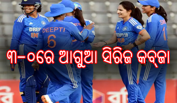 ସିଲ୍ହେଟ୍,୨ା୫:ବାଂଲାଦେଶ ବିପକ୍ଷ ତୃତୀୟ ଅନ୍ତର୍ଜାତୀୟ ଦିନିକିଆ କ୍ରିକେଟ ମ୍ୟାଚରେ ଭାରତ ୭ଉଇକେଟରେ ବିଜୟ ହାସଲ କରିଛି। ଏଥିସହିତ ଦୁଇ ଦଳ ମଧ୍ୟରେ ଚାଲିଥିବା ୫ ମ୍ୟାଚ ବିଶିଷ୍ଟ ଅନ୍ତର୍ଜାତୀୟ ଟି୨୦ କ୍ରିକେଟ ସିରିଜରେ ଭାରତ ୩-୦ରେ ଅଗ୍ରଣୀ ସହ ଆଗୁଆ ସିରିଜ କବ୍ଜା କରିନେଇଛି।