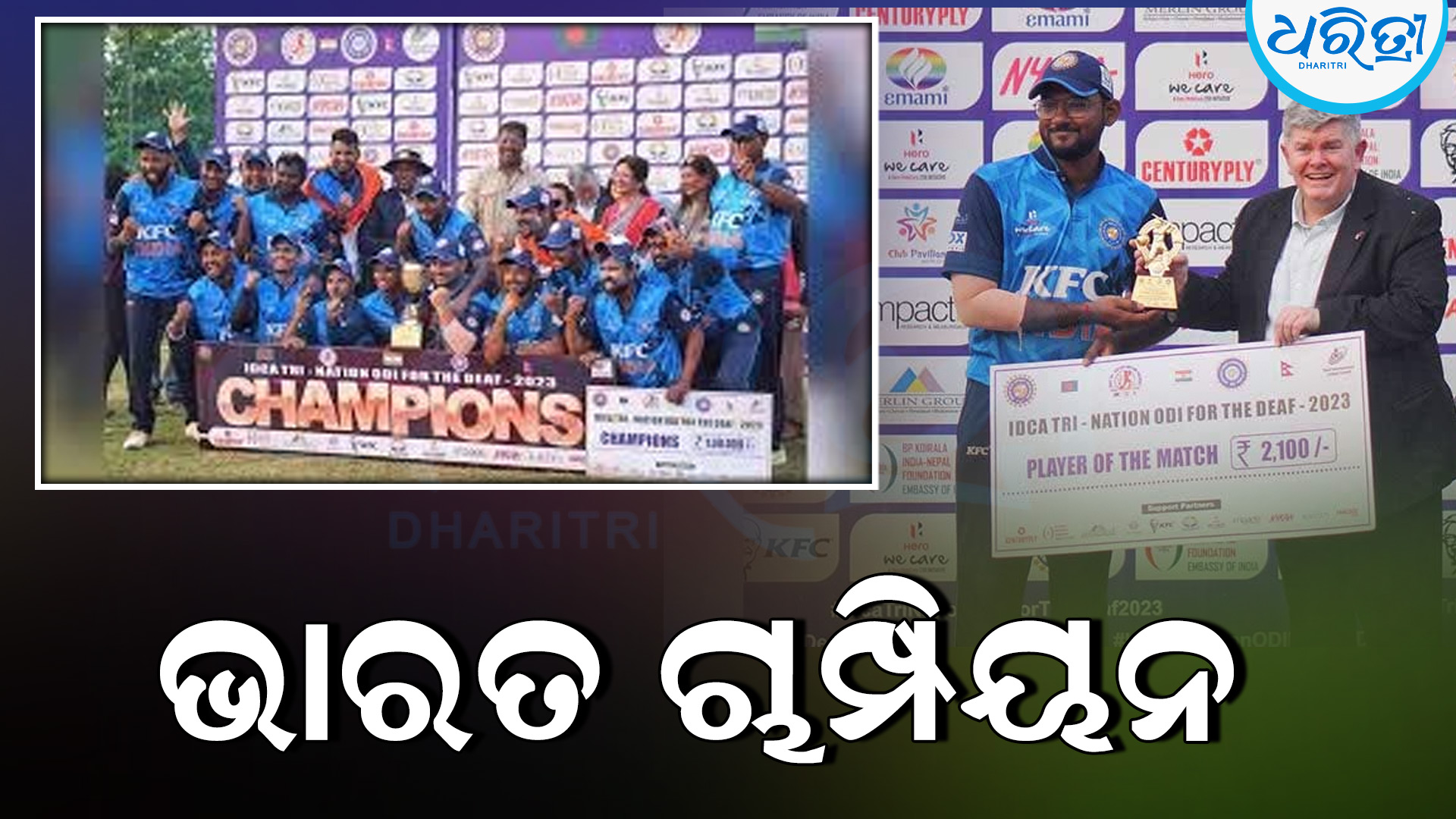ନୂଆଦିଲ୍ଲୀ,୮ା୩: କର୍ନେଲ ସିଂ ଷ୍ଟାଡିୟମରେ ଚାଲିଥିବା ଅନ୍ତର୍ଜାତୀୟ ବଧିର ଟି୨୦ ତ୍ରିରାଷ୍ଟ୍ରୀୟ ସିରିଜରେ ଭାରତ ଚାମ୍ପିୟନ ହୋଇଛି। ଦଳ ଶନିବାର ଫାଇନାଲରେ ୭ ଉଇକେଟରେ ଅଷ୍ଟ୍ରେଲିଆକୁ ପରାସ୍ତ କରିଛି। ଭାରତୀୟ ବଧିର କ୍ରିକେଟ ଆସୋସିଏଶନ ଆନୁକୂଲ୍ୟରେ ଅୟୋଜିତ ଏହି ଟୁର୍ନାମେଣ୍ଟରେ ଅନ୍ୟତମ ଦଳ ଭାବେ ଦକ୍ଷିଣ ଆଫ୍ରିକା ଭାଗ ନେଇଥିଲା।
