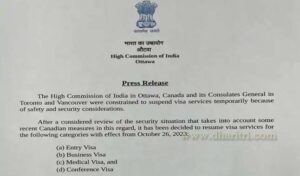 ସୂଚନାଯୋଗ୍ୟ, ଖଲିସ୍ତାନୀ ଆତଙ୍କବାଦୀ ହରଦିପ୍ ସିଂ ନିଜ୍ଜର ହତ୍ୟା ମାମଲାରେ ଭାରତ-କାନାଡା ସମ୍ପର୍କରେ ତିକ୍ତତା ବୃଦ୍ଧି ପାଇଥିଲା। ଭାରତୀର ବୈଦେଶିକ ମନ୍ତ୍ରଣାଳୟର ମୁଖପାତ୍ର ଅରିନ୍ଦମ ବାଗଚି ସେପ୍ଟେମ୍ବର ୨୧ରୁ ଭିଜା ସେବାକୁ ସ୍ଥଗିତ ରଖାଯିବା ନେଇ ସୂଚନା ଦେଇଥିଲେ।