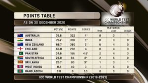 ମେଲବୋର୍ନରେ ଟିମ୍ ଇଣ୍ଡିଆ ୮ ଉଇକେଟରେ ଅଷ୍ଟ୍ରେଲିଆକୁ ହରାଇ ଦେଇଥିଲା। ଏହି ବିଜୟ ଯୋଗୁ ଭାରତ ହାତେଇଛି ୩୦ ପଏଣ୍ଟ। ଏବେ ୩୯୦ ପଏଣ୍ଟ ଓ ୭୨.୨ ପିସିଟି ସହ ଭାରତୀୟ ଦଳ ଦ୍ୱିତୀୟ ସ୍ଥାନରେ ରହିଛି। ଆଇସିସି ବିଶ୍ୱ ଟେଷ୍ଟ ଚାମ୍ପିୟନଶିପ୍ରେ ୧୧ଟି ମ୍ୟାଚ୍ ଖେଳିଥିବା ଭାରତ ୮ଟି ବିଜୟ ଲାଭ କରିଛି। ବକ୍ସିଂ ଡେ’ ଟେଷ୍ଟରେ ପରାଜୟ ଓ ଧିମା ବୋଲିଂ ଲାଗି ୪ ପଏଣ୍ଟ ହରାଇବା ପରେ ମଧ୍ୟ ୭୬.୬ ପିସିଟି ସହ ଶୀର୍ଷରେ ରହିଛି ଅଷ୍ଟ୍ରେଲିଆ (୩୨୨ ପଏଣ୍ଟ )। ଏହି ଦୁଇ ଦଳ ବ୍ୟତୀତ ନ୍ୟୁଜିଲାଣ୍ଡ, ଇଂଲଣ୍ଡ ଓ ପାକିସ୍ତାନ ଟପ୍ ୫ରେ ପଛକୁ ପଛ ରହିଛନ୍ତି।