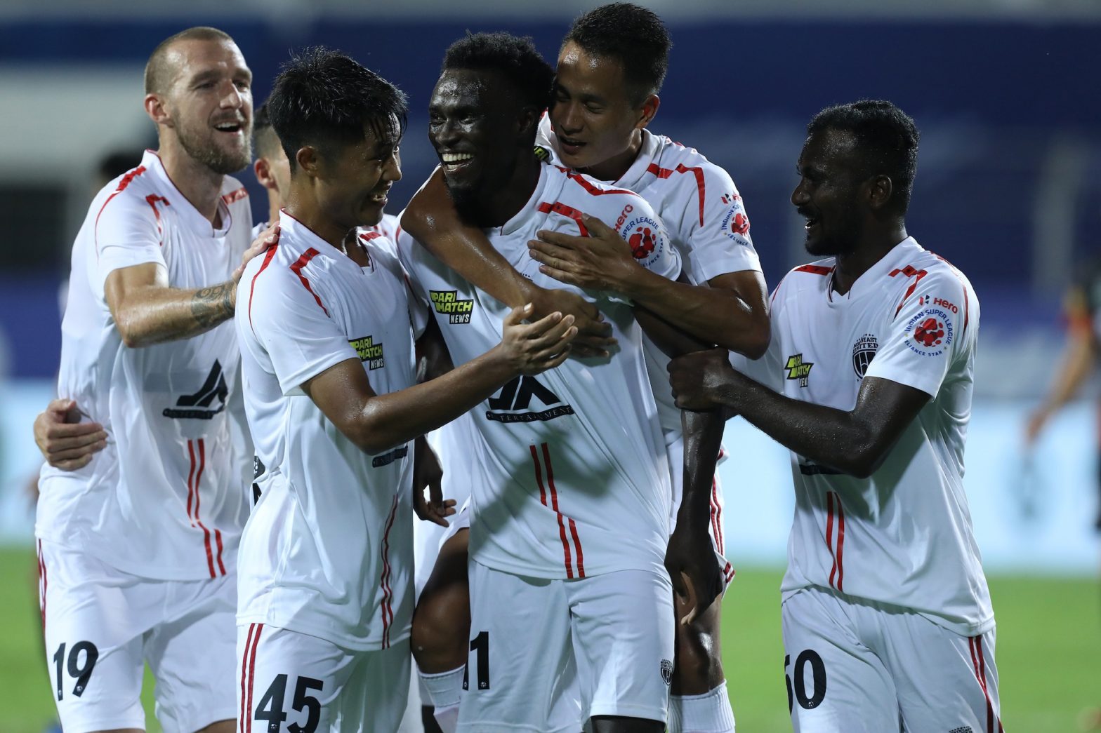 ଟୁର୍ନାମେଣ୍ଟରେ ନିଜର ପ୍ରଥମ ୨ଟି ମ୍ୟାଚରେ ଅପରାଜେୟ ରହିଥିବା ନର୍ଥଇଷ୍ଟ ୟୁନାଇଟେଡ ଏଠାରେ ମଧ୍ୟ ଆରମ୍ଭରୁ ପ୍ରଭାବୀ ପ୍ରଦର୍ଶନ କରିଥିଲା। ଏଫସି ଗୋଆ କଡ଼ା ଚ୍ୟାଲେଞ୍ଜ ଦେଇଥିଲେ ମଧ୍ୟ ଅଧଘଣ୍ଟା ପର୍ଯ୍ୟନ୍ତ କୌଣସି ଦଳ ଗୋଲ ଦେଇପାରି ନ ଥିଲେ। ନର୍ଥଇଷ୍ଟର ଇଦ୍ରିସା ସିଲା ପ୍ରତିପକ୍ଷ ବକ୍ସ ମଧ୍ୟରେ ଥିବାବେଳେ ୩୮ତମ ମିନିଟରେ ତାଙ୍କ ନିକଟକୁ ଡାହାଣ ପଟରୁ ଏକ କ୍ରସ୍ପାସ୍ ଦେଇଥିଲେ ବ୍ରିଟୋ ପି.ଏମ.। ମାତ୍ର ସିଲା ବଲ୍କୁ ଟଚ୍ କରିବା ପୂର୍ବରୁ ଗୋଆ ଦଳର ଇଭାନ ଗାରିଡୋ ଗୋଞ୍ଜାଲେଜ ପଛରୁ ଟାଣି ତାଙ୍କୁ ତଳେ ପକାଇ ଦେଇଥିଲେ। ଫଳରେ ରେଫରି ନର୍ଥଇଷ୍ଟକୁ ପେନାଲ୍ଟି ସୁଯୋଗ ଦେଇଥିଲେ। ସିଲା ଡାହାଣପଟ କର୍ନରରେ ଲୋ ଶଟ୍ ମାରି ଗୋଲ କରିଥିଲେ ହେଁ ରେଫରି ତାହାକୁ ନାକଚ କରିଥିଲେ ଏବଂ ଆଉଥରେ ପେନାଲ୍ଟି ଶଟ୍ ମାରିବାକୁ ପରାମର୍ଶ ଦେଇଥିଲେ। କାରଣ ସିଲା ଶଟ୍ ମାରିବା ପୂର୍ବରୁ ବକ୍ସ ଭିତରେ ଗୋଆରେ ଲାଲରେମପୁଇଆ ଫନାଇ ଚାର୍ଜ କରିବାକୁ ଆଗଭର ହୋଇଯାଇଥିଲେ। ଦ୍ୱିତୀୟ ଉଦ୍ୟମରେ ମଧ୍ୟ ସିଲା ସଫଳ ହୋଇଥିଲେ। ଏଥର ସେ ଶଟ୍କୁ ସିଧା ପୋଷ୍ଟର ମଧ୍ୟଭାଗକୁ ମାରିଥିବାବେଳେ ଗୋଲକିପର ମହମ୍ମଦ ନଓ୍ବାଜ ବାମପଟକୁ ଡାଇଭ୍ ମାରିଥିଲେ। ୪୦ତମ ମିନିଟରେ ଗୋଲ ବଳରେ ନର୍ଥଇଷ୍ଟ ଅଗ୍ରଣୀ ହାସଲ କରିଥିଲା। ମାତ୍ର ଦଳର ଏହି ଖୁସି ବେଶୀ ସମୟ ତିଷ୍ଠି ନ ଥିଲା। ଏହାର ୩ ମିନିଟ ଅର୍ଥାତ୍ ୪୩ତମ ମିନିଟରେ ଗୋଆ ଗୋଲଟି ପରିଶୋଧ କରି ଦେଇଥିଲା। ବାମପଟରୁ ଆଗକୁ ବଢ଼ୁଥିବା ଗୋଆର ବ୍ରେଣ୍ଡନ ଫର୍ନାଣ୍ଡିଜ୍ ନର୍ଥଇଷ୍ଟ ଖେଳାଳିଙ୍କୁ ଚକ୍ମା ଦେଇ ବଲ୍କୁ ବକ୍ସ ଏରିଆକୁ ପଠାଇବାରେ ସକ୍ଷମ ହୋଇଥିଲେ। ସେଠାରେ ପୂର୍ବରୁ ଉପସ୍ଥିତ ଥିବା ଆଙ୍ଗୁଲୋ ଆଲ୍ବୋନିଗା ବଲ୍କୁ ନେଟ୍ ମଧ୍ୟକୁ ପଠାଇବାରେ କୌଣସି ଭୁଲ କରି ନ ଥିଲେ। ଚଳିତ ଲିଗ୍ରେ ଆଙ୍ଗୁଲୋଙ୍କର ଏହାଥିଲା ତୃତୀୟ ଗୋଲ। ଫଳରେ ପ୍ରଥମାର୍ଦ୍ଧ ଶେଷସୁଦ୍ଧା ସ୍କୋର ୧-୧ ସ୍ଥିତିରେ ରହିଥିଲା। ଦ୍ୱିତୀୟାର୍ଦ୍ଧରେ ଆକ୍ରମଣ ପ୍ରତିଆକ୍ରମଣ ଜୋରଦାର ହୋଇଥିଲେ ହେଁ ଉଭୟ ଦଳ ସମକକ୍ଷ ପ୍ରଦର୍ଶନ କରିଥିଲେ। ଉଭୟ ଦଳର କୋଚ୍ ଏକାଧିକ ଖେଳାଳି ପରିବର୍ତ୍ତନ କରିଥିଲେ ହେଁ ଗୋଲ ସ୍କୋର ହୋଇପାରି ନ ଥିଲା। ୯୦ ମିନିଟ ପରେ ୫ ମିନିଟର ଇଞ୍ଜୁରି ଟାଇମ୍ ମିଳିଥିଲା। ମାତ୍ର ଏଥିରେ ମଧ୍ୟ ଗୋଲ ଦେବାରେ ସକ୍ଷମ ନ ହେବାରୁ ଦୁଇଦଳ ପଏଣ୍ଟ ଭାଗ କରିଥିଲେ।