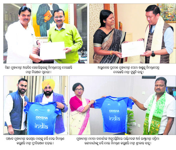 ସେହିପରି ବାଣିଜ୍ୟ ଓ ପରିବହନ ମନ୍ତ୍ରୀ ଟୁକୁନି ସାହୁ କୋଲକାତାଠାରେ ଅରୁଣାଚଳ ପ୍ରଦେଶ ମୁଖ୍ୟମନ୍ତ୍ରୀ ପେମା ଖଣ୍ଡୁଙ୍କୁ ସାକ୍ଷାତ କରି ମୁଖ୍ୟମନ୍ତ୍ରୀଙ୍କ ପକ୍ଷରୁ ହକି ବିଶ୍ୱକପ୍କୁ ଆସିବା ପାଇଁ ନିମନ୍ତ୍ରଣପତ୍ର ଓ ଜର୍ସି ପ୍ରଦାନ କରିଛନ୍ତି। ଅର୍ଥମନ୍ତ୍ରୀ ନିରଞ୍ଜନ ପୂଜାରୀ ଦିଲ୍ଲୀ ମୁଖ୍ୟମନ୍ତ୍ରୀ ଅରବିନ୍ଦ କେଜରିଓ୍ବାଲଙ୍କୁ ନୂଆଦିଲ୍ଲୀଠାରେ ସାକ୍ଷାତ କରି ମୁଖ୍ୟମନ୍ତ୍ରୀଙ୍କ ପକ୍ଷରୁ ହକି ବିଶ୍ୱକପ୍ ପାଇଁ ନିମନ୍ତ୍ରଣପତ୍ର, ଜର୍ସି ସହିତ ରୁପାର ଏକ ଅଶୋକଚକ୍ର ପ୍ରଦାନ କରି ନିମନ୍ତ୍ରଣ କରିଛନ୍ତି। ଶ୍ରମ ଓ କର୍ମଚାରୀ ବୀମା ମନ୍ତ୍ରୀ ଶ୍ରୀକାନ୍ତ ସାହୁ ପଶ୍ଚିମବଙ୍ଗ ମୁଖ୍ୟମନ୍ତ୍ରୀ ମମତା ବାନାର୍ଜୀଙ୍କୁ ଓଡ଼ିଶାରେ ହେବାକୁ ଥିବା ହକି ବିଶ୍ୱକପ୍ ଦେଖିବା ପାଇଁ ନିମନ୍ତ୍ରଣ କରିଛନ୍ତି। ମମତା ଜରୁରୀ କାମ ଯୋଗୁ ଆସି ନ ପାରିବାରୁ ତାଙ୍କ ବଦଳରେ ପଶ୍ଚିମବଙ୍ଗ ଅର୍ଥ ରାଷ୍ଟ୍ରମନ୍ତ୍ରୀ ଚନ୍ଦ୍ରିମା ଭଟ୍ଟାଚାର୍ଯ୍ୟଙ୍କୁ ମୁଖ୍ୟମନ୍ତ୍ରୀ ନବୀନ ପଟ୍ଟନାୟକ ଦେଇଥିବା ନିମନ୍ତ୍ରଣପତ୍ର, ଜର୍ସି ଓ ରୁପାର ଅଶୋକଚକ୍ର ପ୍ରଦାନ କରିଛନ୍ତି।