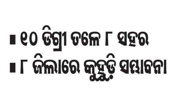 ଭୁବନେଶ୍ୱର,୨୧ା୧୨(ବ୍ୟୁରୋ): ଉତ୍ତର-ପୂର୍ବ ଦିଗରୁ ରାଜ୍ୟକୁ ଥଣ୍ଡା ବାୟୁ ପ୍ରବାହିତ ହେଉଛି। ଏହାର ପ୍ରଭାବରେ ରାଜ୍ୟରେ ଗତ କିଛିଦିନ ହେବ ପାରଦ ତଳମୁହାଁ ରହିଛି। ବିଶେଷ କରି ଆଭ୍ୟନ୍ତରୀଣ ଓ ପଶ୍ଚିମ ଓଡ଼ିଶାରେ ଶୀତର ପ୍ରକୋପ ଅଧିକ ରହିଛି। ଅଧିକାଂଶ ସ୍ଥାନରେ ସର୍ବନିମ୍ନ ତାପମାତ୍ରା ୧୧ ଡିଗ୍ରୀ ସେଲ୍ସିୟସ ତଳକୁ ଖସିଯାଇଛି। ରାଜ୍ୟର ୮ ସ୍ଥାନରେ ସର୍ବନିମ୍ନ ତାପମାତ୍ରା ୧୦ ଡିଗ୍ରୀ ସେଲ୍ସିୟସ ତଳେ ରହିଛି। ଆଞ୍ଚଳିକ ପାଣିପାଗ କାର୍ଯ୍ୟାଳୟ ସୂଚନା ଅନୁଯାୟୀ ମଙ୍ଗଳବାର ଫୁଲବାଣୀରେ ସର୍ବନିମ୍ନ ତାପମାତ୍ରା ୭.୫ ଡିଗ୍ରୀ ସେଲସିୟସ ରେକର୍ଡ କରାଯାଇଥିବା ବେଳେ କୋରାପୁଟ ୮, କେନ୍ଦୁଝର ୮.୪, ସୁନ୍ଦରଗଡ଼ ୯, ଝାରସୁଗୁଡ଼ା ୯.୬, ଦାରିଙ୍ଗବାଡ଼ି ୧୦, ଅନୁଗୋଳ ୧୦, ହୀରାକୁଦ ୧୦.୯, ଭବାନୀପାଟଣା ୧୦, ସୋନପୁର ୧୧, ବରଗଡ଼ ୧୧.୮, ଦେବଗଡ଼ ୧୧.୬, ସମ୍ବଲପୁର ୧୨.୪, କଟକ ୧୩.୪, ଭୁବନେଶ୍ୱରରେ ସର୍ବନିମ୍ନ ତାପମାତ୍ରା ୧୩.୬ ଡିଗ୍ରୀ ସେଲ୍ସିୟସ ରେକର୍ଡ କରାଯାଇଛି। ତେବେ ଆସନ୍ତା ୨୪ ତାରିଖରୁ ରାଜ୍ୟରେ ଶୀତ କମିବ। ପଶ୍ଚିମାବାୟୁ ପ୍ରବାହ ଯୋଗୁ ସୁନ୍ଦରଗଡ଼, ଝାରସୁଗୁଡ଼ା, ସମ୍ବଲପୁର, ବରଗଡ଼ ଜିଲାରେ ଘଡ଼ଘଡ଼ି ସହ ବର୍ଷା ହେବାର ସମ୍ଭାବନା ରହିଛି। ଏଥିଯୋଗୁ ୪ ଦିନ ତାପମାତ୍ରା ଉପର ମୁହଁା ରହିବ। ପୁଣି ୨୮ ତାରିଖରୁ ଶୀତ ବଢ଼ିବା ସମ୍ଭାବନା ରହିଛି। ଆସନ୍ତା ୨୪ ଘଣ୍ଟା ମଧ୍ୟରେ କୋରାପୁଟ, କଳାହାଣ୍ଡି, କନ୍ଧମାଳ, ବୌଦ୍ଧ, ଅନୁଗୋଳ, ଢେଙ୍କାନାଳ, ଯାଜପୁର ଏବଂ ଭଦ୍ରକ ଜିଲାର କେତେକ ସ୍ଥାନରେ କୁହୁଡ଼ି ହେବାର ସମ୍ଭାବନା ରହିଛି ।