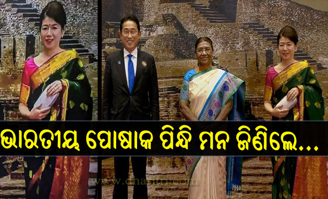 ଜାପାନର ପ୍ରଥମ ମହିଳାଙ୍କୁ ଭାରତର ପାରମ୍ପରିକ ସିଲ୍କ ଶାଢ଼ିରେ ଦେଖିବାକୁ ମିଳିଥିଲା। ନୀଳ ରଙ୍ଗ ଶାଢ଼ି ପିନ୍ଧି ସେ ପୁରା ଭାରତୀୟ ଭଳି ଲାଗୁଥିଲେ। ଏବେ ତାଙ୍କର ଏହି ଫଟୋ ଭାଇରାଲ ହେଉଛି। ଲୋକେ ତାଙ୍କୁ ବହୁତ ପ୍ରଶଂସା କରୁଥିବା ଦେଖାଯାଉଛି।