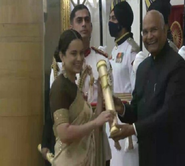 ନୂଆଦିଲ୍ଲୀ,୮ ।୧୧: ବଲିଉଡ୍ ଅଭିନେତ୍ରୀ କଙ୍ଗନା ରାନାୱତ ପଦ୍ମଶ୍ରୀ ସମ୍ମାନରେ ସମ୍ମାନୀତ ହୋଇଛନ୍ତି । ଦେଶର ଚତୁର୍ଥ ବେସାମରିକ ସମ୍ମାନ ପଦ୍ମଶ୍ରୀ ପୁରସ୍କାର ସେ ସୋମବାର ରାଷ୍ଟ୍ରପତି ରାମନାଥ କୋବିନ୍ଦଠାରୁ ଗ୍ରହଣ କରିଛନ୍ତି । ରାଷ୍ଟ୍ରପତି ଭବନରେ ଆୟୋଜିତ ସମାରୋହରେ ତାଙ୍କୁ ଏହି ସମ୍ମାନ ଦିଆଯାଇଛି । ଚଳିତ ଥର ୧୧୯ ଜଣଙ୍କୁ ପଦ୍ମ ସମ୍ମାନରେ ସମ୍ମାନୀତ କରିଛନ୍ତି ରାଷ୍ଟ୍ରପତି ରାମନାଥ କୋବିନ୍ଦ । ଏଥିରୁ ୭ ପଦ୍ମ ବିଭୁଷଣ, ୧୦ ପଦ୍ମଭୂଷଣ ଓ ୧୦୨ ଜଣଙ୍କୁ ପଦ୍ମଶ୍ରୀରେ ସମ୍ମାନୀତ କରାଯାଇଛି । ଏଥର ୨୯ ମହିଳା ପଦ୍ମ ପୁରସ୍କାର ପାଇଁ ମନୋନୀତ ହେଇଥିବା ବେଳେ ୧୬ ଜଣଙ୍କୁ ମରୋଣତ୍ତର ଭାବେ ଏହା ଦିଆଯାଇଛି ଓ ଜଣେ ତୃତୀୟ ଲିଙ୍ଗ ଏଥର ପଦ୍ମ ସମ୍ମାରେ ସମ୍ମାନୀତ ହୋଇଛନ୍ତି ।