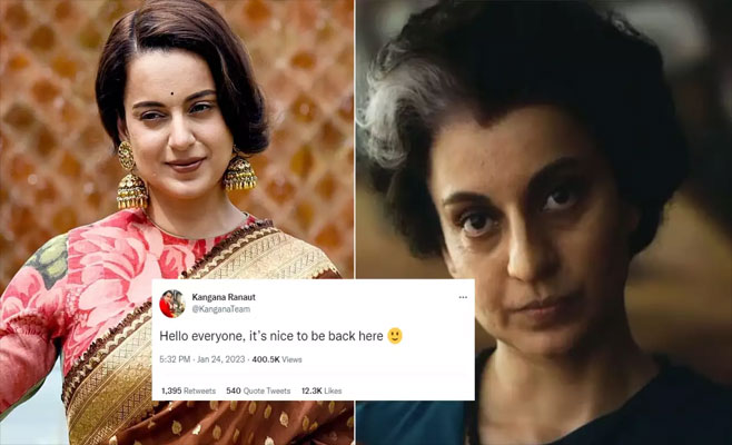 ପ୍ରଥମ ଟୁଇଟ ଭାବେ ଟୁଇଟରକୁ ଫେରି ବହୁତ ଖୁସି ଲାଗୁଥିବା କଙ୍ଗନା କହିଥିଲେ। ଏହାପରେ ନିଜର ଫିଲ୍ମର ‘ବିହାଇଣ୍ଡ ଦ ସିନ୍’ର ଏକ ଭିଡିଓ ଶେୟାର କରି ସେ ଆଉ ଏକ ଟୁଇଟ୍ କରିଛନ୍ତି। ଅକ୍ଟୋବର ୨୦ରେ ଫିଲ୍ମ ‘ଏମରଜେନ୍ସିଂ’ ରିଲିଜ ହେବ ବୋଲି ସେ ଜଣାଇଛନ୍ତି।