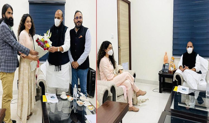ନୂଆଦିଲ୍ଲୀ,୧୩।୧୨-ପ୍ରତିରକ୍ଷା ମନ୍ତ୍ରୀ ରାଜନାଥ ସିଂଙ୍କୁ ରବିବାର ବଲିଉଡ ଅଭିନେତ୍ରୀ କଙ୍ଗନା ରାଣାଓ୍ବତ୍ ଭେଟିଛନ୍ତି। ନିଜର ଆଗାମୀ ଫିଲ୍ମ ତେଜସରେ କଙ୍ଗନା ଭାରତୀୟ ବାୟୁସେନାର ପାଇଲଟ ଭୂମିକାରେ ନଜର ଆସିବେ। ଏଥିପାଇଁ ସେ ପ୍ରତିରକ୍ଷା ମନ୍ତ୍ରୀ ରାଜନାଥ ସିଂଙ୍କଠାରୁ ଆର୍ଶୀବାଦ ଲୋଡିଛନ୍ତି। କଙ୍ଗନାଙ୍କ ସମେତ ତାଙ୍କ ତେଜସ ଟିମର ଅନ୍ୟ ସଦସ୍ୟମାନେ ଉପସ୍ଥିତ ଥିଲେ। ଏ ନେଇ କଙ୍ଗନା ଟୁଇଟ କରି ସୂଚନା ଦେଇଛନ୍ତି।