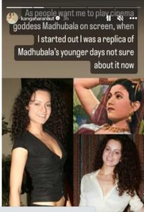 କଙ୍ଗନା ମୋଗଲ-ଏ-ଆଜମ ଆକ୍ଟ୍ରେସଙ୍କ ସହ ତାଙ୍କ ଫଟୋ କୋଲାଜ କରି ଶେୟାର କରିଛନ୍ତି ଆଉ ଲେଖିଛନ୍ତି, ଯେମିତି ଦର୍ଶକେ କହୁଛନ୍ତି ଯେ ମୁଁ ବଡ ପରଦାରେ ମଧୁବାଲାଙ୍କ ଚରିତ୍ରରେ କାମ କରେ, ଯେତେବେଳେ ମୁଁ ମୋ କ୍ୟାରିୟର ଆରମ୍ଭ କରିଥିଲି ସେତେବେଳେ ମୁଁ ମଧୁବାଲାଙ୍କ ଯବାନି ଦିନର କପି ଲାଗୁଥିଲି, ହେଲେ ଏବେ ଏହା ମୋତେ ଜଣାନାହିଁ ।