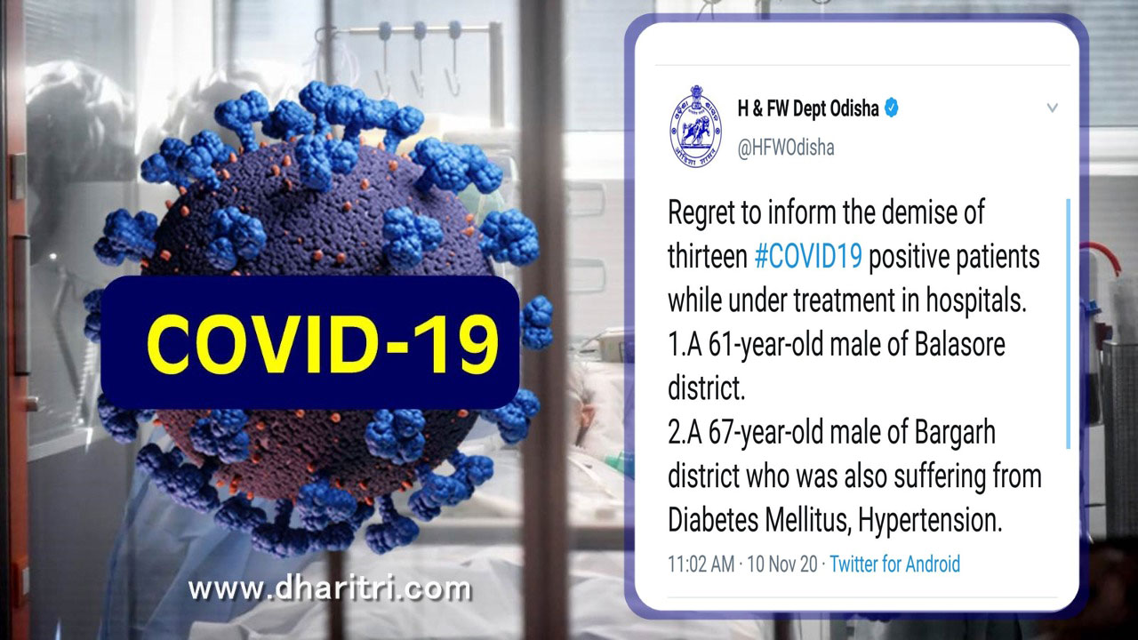 ଭୁବନେଶ୍ୱର,୧୦।୧୧(ବ୍ୟୁରୋ): ରାଜ୍ୟରେ ମଙ୍ଗଳବାର ଆଉ ୧୩ ଜଣଙ୍କ ମୁଣ୍ଡ ନେଇଛି କରୋନା। ଏହାକୁ ମିଶାଇ ରାଜ୍ୟରେ କରୋନା ଜନିତ ମୃତ୍ୟୁ ସଂଖ୍ୟା ୧୪୫୪ ରେ ପହଞ୍ଚିଥିବା ରାଜ୍ୟ ସ୍ବାସ୍ଥ୍ୟ ଓ ପରିବାର କଲ୍ୟାଣ ବିଭାଗ ପକ୍ଷରୁ ସୂଚନା ମିଳିଛି। ତେବେ ରାଜ୍ୟରେ କରୋନା ପଜିଟିଭ୍ଙ୍କ ସଂଖ୍ୟା କମୁଥିବା ବେଳେ କରୋନା ମୃତ୍ୟୁ ହାର କମିବାର ନାଁ ନେଉନି। ଯାହାକି ଚିନ୍ତାର ବିଷୟ ହୋଇଛି।
