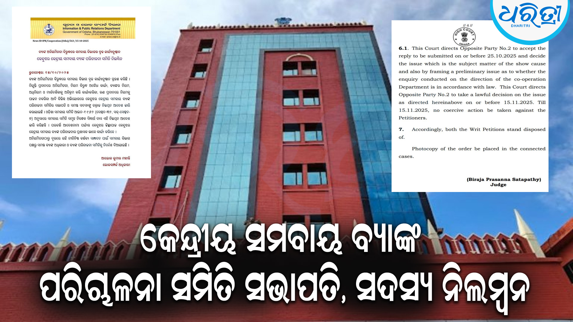 କେନ୍ଦୁଝର/ହାଟଡିହୀ,୧୭।୧୦(ନରେଶ ଚନ୍ଦ୍ର ପଟ୍ଟନାୟକ/ଶୁଭକାନ୍ତ ନାୟକ): କେନ୍ଦୁଝର କେନ୍ଦ୍ରୀୟ ସମବାୟ ବ୍ୟାଙ୍କ ପରିଚାଳନା ସମିତିର ସଭାପତି ଏବଂ ସମସ୍ତ ସଦସ୍ୟଙ୍କୁ ନିଲମ୍ବନ ଆଦେଶ ଘଟଣା ସମ୍ପର୍କିତ ଏକ ନୂଆ ତଥ୍ୟ ପଦାକୁ ଆସିଛି ।କାର୍ଯ୍ୟାନୁଷ୍ଠାନ ନ ନେବାକୁ ମାନ୍ୟବର ଓଡିଶା ହାଇକୋର୍ଟ ନିର୍ଦ୍ଦେଶ ଦେବାର ପରଦିନ ସମବାୟ ସମିତି ସମୂହ ନିବନ୍ଧକ ନିଲମ୍ବନ ଆଦେଶ ଜାରି କରିଥିଲେ। ଯାହାକି ଏବେ ଗୁରୁତର ପ୍ରସଙ୍ଗ ସାଜିଛି l