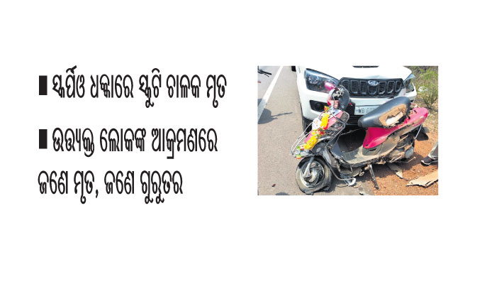 ବାରିପଦା ଅଫିସ/ବାଙ୍ଗିରିପୋଷି,୨୦।୪(ଡି.ଏନ.ଏ.): ଦୁର୍ଘଟଣାରେ ଜଣେ ସ୍କୁଟି ଚାଳକଙ୍କ ମୃତ୍ୟୁକୁ କେନ୍ଦ୍ରକରି ମଙ୍ଗଳବାର ମୟୂରଭଞ୍ଜ ଜିଲା ବାଙ୍ଗିରିପୋଷି ଥାନା ଅଞ୍ଚଳରେ ଘଟିଛି ତୁମୁଳକାଣ୍ଡ। ଦୁର୍ଘଟଣା ଘଟାଇ ସ୍କର୍ପିଓ ଡ୍ରାଇଭର ଫେରାର ହୋଇଯାଇଥିବା ବେଳେ ସେଥିରେ ବସିଥିବା କେନ୍ଦୁଝରସ୍ଥିତ ଏକ ମେଗା ଜଳସେଚନ ପ୍ରକଳ୍ପର ଜଣେ କର୍ମଚାରୀଙ୍କୁ ଉତ୍ତ୍ୟକ୍ତ ଲୋକେ ପିଟିପିଟି ମାରି ଦେଇଛନ୍ତି। ଅନ୍ୟ ଜଣେ କର୍ମଚାରୀ ଗୁରୁତର ଅବସ୍ଥାରେ ଡାକ୍ତରଖାନାରେ ଭର୍ତ୍ତି ହୋଇଛନ୍ତି। ଦୁର୍ଘଟଣା ଓ ହତ୍ୟା ଘଟଣାକୁ ନେଇ ପୋଲିସ ଦୁଇଟି ମାମଲା ରୁଜୁ କରି ତଦନ୍ତ ଜାରି ରଖିଛି।