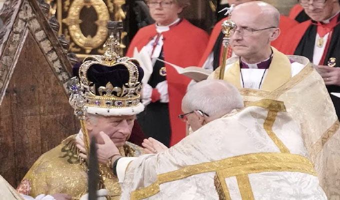 କିଙ୍ଗ ଚାଲର୍ସ ତୃତୀୟ ତାଙ୍କ ସ୍ତ୍ରୀ ରାଣୀ କାମିଲାଙ୍କ ସହ ଡାଏମଣ୍ଡ ଜୁବୁଲି ଷ୍ଟେଟ୍ କୋଚ୍(ଘୋଡ଼ାଗାଡ଼ି)ରେ ଆବେକୁ ଆସିଥିଲେ। ଏହା ପରେ ଇଂଲଣ୍ଡ ଚର୍ଚ୍ଚର ଉଚ୍ଚପଦରେ ଥିବା କ୍ଲେରିକ ଏବଂ କାଣ୍ଟେରବରି ଜଷ୍ଟିନ ଓ୍ବେଲବିର ଆର୍ଚବିଶପ ଚାଲର୍ସଙ୍କୁ ରାଜମୁକୁଟ ପିନ୍ଧାଇବା ସହ ଶପଥ ପାଠ କରାଇଥିଲେ।