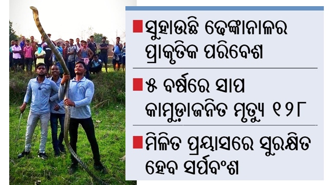 ଢେଙ୍କାନାଳ ଅଫିସ, ୧୦।୮: ଢେଙ୍କାନାଳର ପ୍ରାକୃତିକ ପରିବେଶ ସର୍ପବଂଶ ବୃଦ୍ଧିରେ ସହାୟକ ହୋଇଛି। ଏଠାକାର ସଂରକ୍ଷିତ ଜଙ୍ଗଲ, ପାହାଡ଼ ଖୋଲ ସାପଙ୍କ ସୁରକ୍ଷିତ ଆବାସସ୍ଥଳୀ ପାଲଟିଛି। ବୁଦୁବୁଦିଆ ଜଙ୍ଗଲ, ଜମି, ଜଳାଶୟ ଅବବାହିକାରେ ପର୍ଯ୍ୟାପ୍ତ ପରିମାଣରେ ଖାଦ୍ୟ ମିଳୁଥିବାରୁ ଗତ କିଛିବର୍ଷ ମଧ୍ୟରେ ଜିଲାରେ ଅହିରାଜ ଏବଂ ଅଜଗର ପ୍ରଜାତିର ସାପଙ୍କ ସଂଖ୍ୟା ବଢ଼ିବାରେ ଲାଗିଛି। ଅନ୍ୟପଟେ ଗତ ୫ବର୍ଷରେ ସାପ କାମୁଡ଼ାରେ ୧୨୮ଜଣଙ୍କ ମୃତ୍ୟୁ ହୋଇଥିବା ସରକାରୀ ରିପୋର୍ଟ କହୁଛି। ସାପ କାମୁଡ଼ାଜନିତ ମୃତ୍ୟୁସଂଖ୍ୟା ହ୍ରାସ କରିବାକୁ ବ୍ୟାପକ ଜନସଚେତନତା ଆବଶ୍ୟକ ଥିବାବେଳେ ସରକାରୀ, ବେସରକାରୀସ୍ତରରେ ମିଳିତ ପ୍ରୟାସ ହେଲେ ପ୍ରକୃତିର ବରଦାନ ଏହି ସରୀସୃପ ବଂଶ ସୁରକ୍ଷିତ ହୋଇପାରିବ ବୋଲି ପରିବେଶବିତ୍ ମତ ଦେଇଛନ୍ତି।
