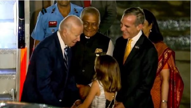 ପାଲମ ବିମାନବନ୍ଦରରେ ଆମେରିକାର ରାଷ୍ଟ୍ରପତି ଜୋ ବାଇଡେନଙ୍କୁ ସ୍ବାଗତ କରିବା ପାଇଁ କେନ୍ଦ୍ର ସରକାରଙ୍କ ପକ୍ଷରୁ କେନ୍ଦ୍ରୀୟ ମନ୍ତ୍ରୀ ଜେନେରାଲ ଭି.କେ ସିଂ ଭାରତ ପହଞ୍ଚିଥିଲେ। ତାଙ୍କୁ ଭାରତରେ ଆମେରିକାର ରାଷ୍ଟ୍ରଦୂତ ଏରିକ ଗାରସେଟି ମଧ୍ୟ ସ୍ବାଗତ କରିବାକୁ ଆସିଥିଲେ। ବାଇଡେନ ବିମାନବନ୍ଦରରେ ଅବତରଣ କରିଥିଲେ ଏବଂ ତାଙ୍କୁ ସ୍ବାଗତ କରିବାକୁ ଏକତ୍ରିତ ହୋଇଥିବା ସମସ୍ତଙ୍କୁ ଅଭିବାଦନ ଜଣାଇଥିଲେ। ଏହି ସମୟ ମଧ୍ୟରେ ସେ ଏରିକ ଗାରସେଟିଙ୍କ ୧୨ବର୍ଷର ଝିଅ ମାୟା ଜୁଆନିଟାଙ୍କ ଶୁଭେଚ୍ଛା ମଧ୍ୟ ଗ୍ରହଣ କରିଥିଲେ। ଆମେରିକାର ରାଷ୍ଟ୍ରପତି ମାୟାଙ୍କୁ ଆଲିଙ୍ଗନ କରିବା ସହ ତାଙ୍କ ସହ ମଧ୍ୟ କଥା ହୋଇଥିଲେ। କୌତୁହଳର ବିଷୟ ହେଉଛି ଯେ ସେ ସେହି ଝିଅ ସହିତ ଯେତେ ସମୟ ପର୍ଯ୍ୟନ୍ତ କଥା ହୋଇଥିଲେ ସେ ଅନ୍ୟ ଲୋକଙ୍କ ସହ ସେତିକି ସମୟ କଥାବାର୍ତ୍ତା ମଧ୍ୟ କରି ନ ଥିଲେ।