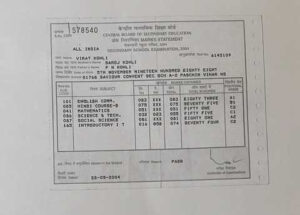 ବିରାଟ ତାଙ୍କ ଦଶମ ଶ୍ରେଣୀର ମାର୍କଶିଟ ପ୍ରଶଂସକଙ୍କ ସହ ଶେୟାର କରିଛନ୍ତି। ବିରାଟଙ୍କ ମାର୍କଶିଟ୍ରେ ମୋଟ ୬ଟି ବିଷୟ ଅଛି। କୋହଲି ଇଂରାଜୀରେ ୮୩, ହିନ୍ଦୀ କୋର୍ସ-ବିରେ ୭୫, ଗଣିତରେ ୫୧, ବିଜ୍ଞାନରେ ୫୫, ସାମାଜିକ ବିଜ୍ଞାନରେ ୮୧ ଏବଂ ଇନ୍ଟ୍ରୋଡକ୍ଟୋରି ଆଇଟିରେ ୭୪ ନମ୍ବର ରଖିଥିଲେ।