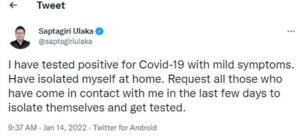 ଭୁବନେଶ୍ବର,୧୪।୧(ବ୍ୟୁରୋ): କୋରାପୁଟ ଏମ୍ପି ସପ୍ତଗିରି ଉଲ୍ଲାକା କରୋନା ସଂକ୍ରମିତ ହୋଇଛନ୍ତି। ଏନେଇ ଏମ୍ପି ଉଲ୍ଲାକା ଶୁକ୍ରବାର ଟୁଇଟ କରି ଏହି ସୂଚନା ଦେଇ କହିଛନ୍ତି।
