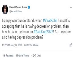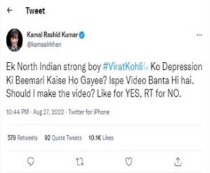 କେଆରକେ କେବଳ ଏତିକିରେ ଅଟକି ନ ଥିଲେ, ସେ ଆଉ ଏକ ଟୁଇଟ କରି ଲେଖିଥିଲେ- ଉତ୍ତର ଭାରତର ଜଣେ ଶକ୍ତିଶାଳୀ ବ୍ୟକ୍ତି (ବିରାଟ କୋହଲି) କିପରି ଡିପ୍ରେସନର ଶିକାର ହେଲେ। ତେବେ ସୋସିଆଲ ମିଡିଆରେ ବହୁ ସମାଲୋଚନା ପରେ କେଆରକେ ଏହି ଟୁଇଟ୍ ସବୁ ଡିଲିଟ କରିଦେଇଛନ୍ତି।