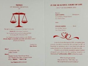 କାର୍ଡରେ ଲେଖାଅଛି, ‘ବିବାହ କରିବାର ଅଧିକାର ହେଉଛି ଭାରତୀୟ ସମ୍ବିଧାନର ଧାରା ୨୧ ଅନୁଯାୟୀ, ରାଇଟ ଟୁ ଲାଇଫର ଏକ ଉପାଦାନ। ତେଣୁ ମୋର ୨୮ ନଭେମ୍ବର ୨୦୨୧ ରବିବାର ଏହି ମୌଳିକ ଅଧିକାରକୁ ବ୍ୟବହାର କରିବାର ସମୟ ଆସିଛି।’
