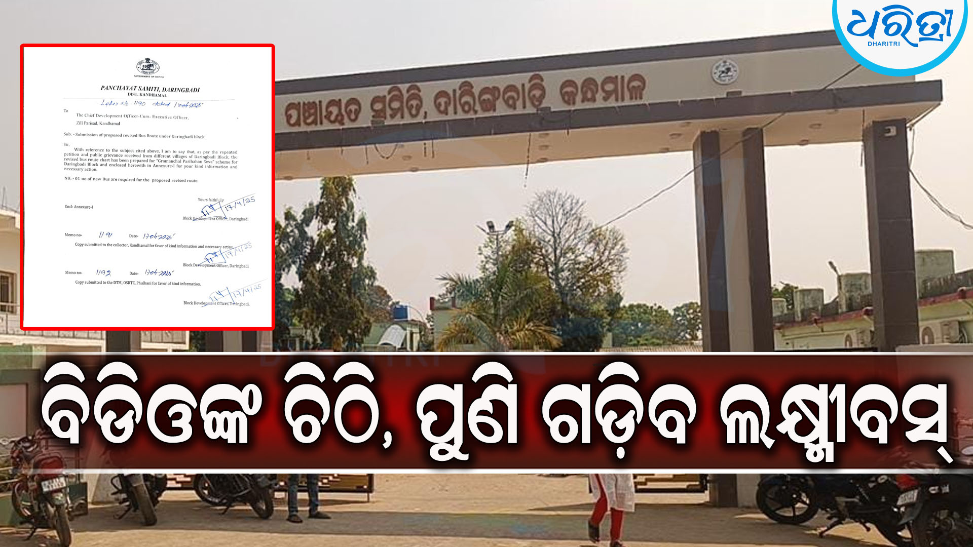ଦାରିଙ୍ଗବାଡ଼ି,୧୮ା୪(ଅରୁଣ ସାହୁ): ଦାରିଙ୍ଗବାଡ଼ିଠାରୁ ଫୁଲବାଣୀକୁ ପୁଣି ଥରେ ଶୀତ ତାପ ନିୟନ୍ତ୍ରଣ ଲକ୍ଷ୍ମୀବସ୍ ଚଳାଚଳ କରିବାକୁ ବାଟ ଖୋଲିଲା। ସ୍ଥାନୀୟ ବିଡିଓ ପ୍ରୀତିରଞ୍ଜନ ରଥ ଏନେଇ ଜିଲା ମୁଖ୍ୟ ଉନ୍ନୟନ ଅଧିକାରୀ- କମ୍-କାର୍ଯ୍ୟନିର୍ବାହୀ ଅଧିକାରୀ ଶମ୍ଭୁନାଥ ନନ୍ଦୀଙ୍କୁ ଚିଠି ଲେଖିଛନ୍ତି। ସେ ସେଥିରେ ଉଲ୍ହେଖ କରିଛନ୍ତି ଯେ, ଦାରିଙ୍ଗବାଡ଼ି ବ୍ଲକର ବିଭିନ୍ନ ଗ୍ରାମରୁ ବାରମ୍ବାର ବସ ଚଳାଚଳ କରାଯିବା ପାଇଁ ଜନସାଧାରଣ ବିଡିଓଙ୍କ ନିକଟରେ ନିବେଦନ କରୁଛନ୍ତି।