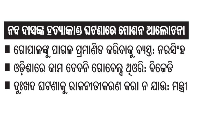 କଂଗ୍ରେସ ବିଧାୟକ ଦଳ ନେତା କହିଛନ୍ତି, ଗୋପାଳ ପାଗଳ ବୋଲି ପ୍ରମାଣ କରିବାକୁ ସରକାର ବ୍ୟସ୍ତ। ଷଡ଼ଯନ୍ତ୍ର ଦିଗ ଉପରେ ଅନୁସନ୍ଧାନ କରାଯାଉନାହିଁ। ତଦନ୍ତରେ ବହୁ ତ୍ରୁଟି ରହିଛି। ଜଣେ କ୍ୟାବିନେଟ୍ ମନ୍ତ୍ରୀଙ୍କୁ ସୁରକ୍ଷା ଦେଇପାରିଲେନି ସରକାର। ଏହା ମୁଖ୍ୟମନ୍ତ୍ରୀଙ୍କ ନୈତିକ ଦାୟିତ୍ୱ। ନବ ଦାସଙ୍କ ଅତ୍ୟଧିକ ରକ୍ତସ୍ରାବ ହେଉଥିବାବେଳେ ରକ୍ତ କିମ୍ବା ଅମ୍ଳଜାନ ଦିଆ ନ ଯିବା ଦୁର୍ଭାଗ୍ୟଜନକ। ଏଭଳି ଘଟଣାରେ ତୁରନ୍ତ କ୍ରାଇମବ୍ରାଞ୍ଚ ତଦନ୍ତ ପାଇଁ ନିର୍ଦ୍ଦେଶ ଦିଆଗଲା। କ୍ରାଇମବ୍ରାଞ୍ଚର ତଦନ୍ତ କ’ଣ ତାହା ସମସ୍ତଙ୍କୁ ଜଣା। ହାଇକୋର୍ଟଙ୍କ ତତ୍ତ୍ବାବଧାନରେ ଏସ୍ଆଇଟି ଗଠନ କରାଯାଇ ଘଟଣାର ଅନୁସନ୍ଧାନ କରାଗଲେ ସତ୍ୟାସତ୍ୟ ସାମ୍ନାକୁ ଆସିବ। ସିବିଆଇ ଉପରେ ତାଙ୍କର କିମ୍ବା ତାଙ୍କ ଦଳର ଭରସା ନାହିଁ ବୋଲି ସେ କହିଛନ୍ତି।