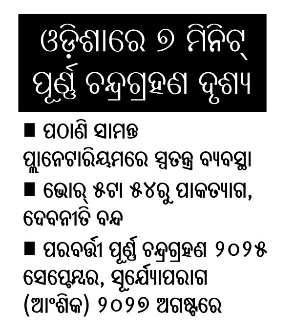 ଭୁବନେଶ୍ୱର, ୭ା୧୧(ବ୍ୟୁରୋ):ଏବର୍ଷର ଶେଷ ପୂର୍ଣ୍ଣ ଚନ୍ଦ୍ରଗ୍ରହଣ ଆସନ୍ତା ୮ ତାରିଖ ମଙ୍ଗଳବାର ଦିନ ସଙ୍ଗଠିତ ହେବ। ଅପରାହ୍ନ ୨ଟା ୩୮ରୁ ଗ୍ରହଣ ସ୍ପର୍ଶ ଓ ୬ଟା ୧୯ରେ ସର୍ବମୋକ୍ଷ ହେବ। ତେବେ ପୂର୍ଣ୍ଣ ଚନ୍ଦ୍ରଗ୍ରହଣ ଅପରାହ୍ନ ୩ଟା ୪୭ରେ ଆରମ୍ଭ ହେଉଥିଲେ ମଧ୍ୟ ଚନ୍ଦ୍ର ଉଦୟ ହୋଇ ନ ଥିବାରୁ ତାହା ଓଡ଼ିଶାକୁ ଦୃଶ୍ୟମାନ ହେବ ନାହିଁ। ଅପରାହ୍ନ ୫ଟା ୫ରେ ଚନ୍ଦ୍ର ଉଦୟ ସମୟରୁ ଓଡ଼ିଶାରେ ୬ରୁ ୭ ମିନିଟ୍‌ ପର୍ଯ୍ୟନ୍ତ ଦୃଶ୍ୟମାନ ହେବ। ବିଭିନ୍ନ ଜିଲାରେ ଏହା ଭିନ୍ନ ଭିନ୍ନ ସମୟରେ ଦେଖାଦେବ। ଭୁବନେଶ୍ୱରରେ ଅପରାହ୍ନ ୫ଟା ୫ରୁ ୫ଟା ୧୧ ପର୍ଯ୍ୟନ୍ତ ଅର୍ଥାତ୍‌ ୬ ମିନିଟ୍‌ ପାଇଁ ପୂର୍ଣ୍ଣ ଚନ୍ଦ୍ରଗ୍ରହଣ ଓ ୫ଟା ୧୧ରୁ ୬ଟା ୧୯ ଯାଏ ଆଂଶିକ ଗ୍ରହଣ ଭାବେ ଦୃଶ୍ୟମାନ ରହିବ। ମଙ୍ଗଳବାର ଭୋର୍‌ ୫ଟା ୫୪ରୁ ପାକତ୍ୟାଗ ସହ ଦେବନୀତି ବନ୍ଦ ରହିବ।