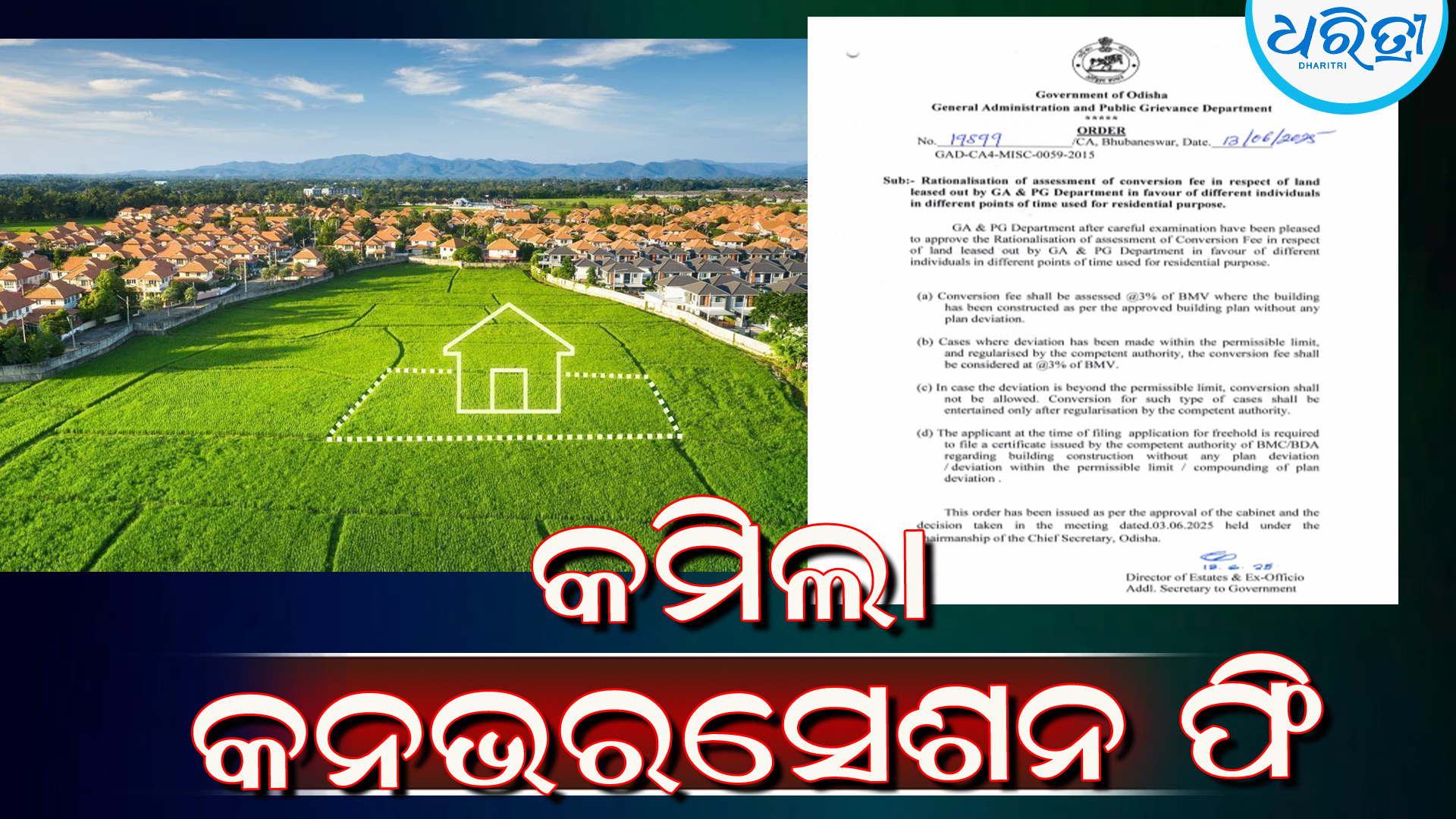 ଭୁବନେଶ୍ୱର,୧୩।୬: ଲିଜ ଜମିକୁ ଫ୍ରି ହୋଲ୍ଡ କରିବାକୁ କମିଲା କନଭରସେଶନ ଫି। ଏଣିକି ଜମିର ବେଞ୍ଚ ମାର୍କ ମୂଲ୍ୟର ୩% ଦେବାକୁ ପଡ଼ିବ। ପୂର୍ବରୁ କନଭରସେଶନ ଫି ୧୦ ପ୍ରତିଶତ ଦେବାକୁ ପଡୁଥିଲା। ଏନେଇ ସାଧାରଣ ପ୍ରଶାସନ ବିଭାଗ ପକ୍ଷରୁ ବିଜ୍ଞପ୍ତି ପ୍ରକାଶ ପ୍ରକାଶ ପାଇଛି।