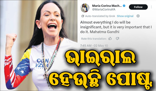 ଓସ୍ଲୋ/କାରାକାସ୍,୧୧ା୧୦: ମାରିନା କୋରିନା ମାଚାଡୋ ନୋବେଲ ଶାନ୍ତି ପୁରସ୍କାର ପାଇବାକୁ ଯାଉଛନ୍ତି ବୋଲି ଘୋଷଣା କରାଯିବା ପରେ ତାଙ୍କର ଏକ ପୋଷ୍ଟ ସୋସିଆଲ ମିଡିଆରେ ବହୁଳ ପ୍ରସାରିତ ହେବାରେ ଲାଗିଛି। ୨୦୧୦ ମେ’ ୧୦ରେ ମାଚାଡୋ ଟୁଇଟର (ବର୍ତ୍ତମାନର X ) ପୋଷ୍ଟରେ ମହାତ୍ମା ଗାନ୍ଧୀଙ୍କୁ ପ୍ରଶଂସା କରି ଉଲ୍ଲେଖ କରିଥିଲେ, ଗାନ୍ଧିଜୀଙ୍କ ମତରେ ଏକ ବୃହତ୍ ଯୋଜନା ଆଗରେ ଏକ ବ୍ୟକ୍ତିଗତ କାର୍ଯ୍ୟ ଛୋଟ ଓ ଗୁରୁତ୍ୱହୀନ ମନେ ହୋଇପାରେ। କିନ୍ତୁ ତାହା ପଦକ୍ଷେପ ନେବା ପାଇଁ ଗୁରୁତ୍ୱପୂର୍ଣ୍ଣ। ଏହି ପୋଷ୍ଟକୁ ନେଇ ୟୁଜର୍ସ ମାଚାଡୋଙ୍କୁ ପ୍ରଶଂସା କରୁଛନ୍ତି।