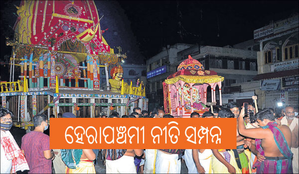 ହେରାପଞ୍ଚମୀ ପାଇଁ ଶ୍ରୀମନ୍ଦିର ଓ ଶ୍ରୀଗୁଣ୍ଡିଚା ମନ୍ଦିରରେ ସ୍ବତନ୍ତ୍ର ନୀତିକାନ୍ତି କରାଯାଇଥିଲା। ଶ୍ରୀଗୁଣ୍ଡିଚା ମନ୍ଦିରରେ ସନ୍ଧ୍ୟାଧୂପ ପରେ ଶ୍ରୀମନ୍ଦିରରେ ମହାଲକ୍ଷ୍ମୀଙ୍କ ମାଜଣା ନୀତି ହୋଇଥିଲା। ବିମଳା ମନ୍ଦିରକୁ ମହାଲକ୍ଷ୍ମୀ ବିଜେ କରି ଅନୁମତି ଆଣିଥିଲେ। ପରେ ଘଣ୍ଟ, ଛତା, କାହାଳୀ ଓ ସେବାୟତଙ୍କ ଗହଣରେ ପାଲିଙ୍କିରେ ବଡ଼ଦାଣ୍ଡ ଦେଇ ଶ୍ରୀଗୁଣ୍ଡିଚା ମନ୍ଦିର ଅଭିମୁଖେ ରାତି ୧୦ଟା ୧୫ରେ ବିଜେ କରିଥିଲେ। ନନ୍ଦିଘୋଷ ରଥ ନିକଟରେ ମହାଲକ୍ଷ୍ମୀଙ୍କ ଆଜ୍ଞାମାଳ ୧୦ଟା ୨୦ରେ ଲାଗି ହେବା ପରେ ପତିମହାପାତ୍ର ସେବକ ବନ୍ଦାପନା, ଚାମର ଆଲଟ, ଘଷା ବିଡ଼ିଆ ଓ ଦହିପଟି ମଣୋହୀ କରିଥିଲେ। ନୀତି ଶେଷ ହୋଇ ଶ୍ରୀଗୁଣ୍ଡିଚା ମନ୍ଦିରରେ ୧୦ଟା ୨୫ରେ ସନ୍ଧ୍ୟାଧୂପ ଟେରା ପୂଜା ଚାଲିଥିବାବେଳେ ଜଗମୋହନକୁ ମହାଲକ୍ଷ୍ମୀ ବିଜେ କରି ଜୟବିଜୟ ଦ୍ୱାର ପାଖକୁ ଯାଇଥିଲେ। ପତିମହାପାତ୍ର ମହାପ୍ରଭୁଙ୍କ ଆଜ୍ଞାମାଳ ଆଣି ମହାଲକ୍ଷ୍ମୀଙ୍କୁ ପ୍ରଦାନ କରିବା ପରେ ଜୟବିଜୟ ଦ୍ୱାର ବନ୍ଦ କରିଦେଇଥିଲେ। ମହାଲକ୍ଷ୍ମୀଙ୍କ ନିବେଦନ ସତ୍ତ୍ୱେ ମହାପ୍ରଭୁ ତାଙ୍କ ସହ ଶ୍ରୀମନ୍ଦିରକୁ ଫେରି ନ ଥିଲେ। ଫଳରେ ମହାଲକ୍ଷ୍ମୀ ଅଭିମାନରେ ନାକଚଣା ଦ୍ୱାର ଦେଇ ଫେରିଥିଲେ। ସେଠାରେ ଭିତରଛ ସେବକ ତାଙ୍କୁ ବନ୍ଦାପନା ଓ ଦହିପଟି ମଣୋହି କରିଥିଲେ। ମହାଲକ୍ଷ୍ମୀ ନନ୍ଦିଘୋଷ ରଥର କିଛି ଅଂଶ ଭାଙ୍ଗି ହେରାଗୋହିରୀ ସାହି ଦେଇ ଶ୍ରୀମନ୍ଦିରକୁ ବାହୁଡ଼ା ବିଜେ କରିଥିଲେ।