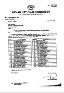 ମୁମ୍ବାଇ,୩୧।୩: ଆଗାମୀ ଲୋକ ସଭା ନିର୍ବାଚନ ପାଇଁ ମହାରାଷ୍ଟ୍ର କଂଗ୍ରେସ ପକ୍ଷରୁ ୪୦ ଷ୍ଟାର ପ୍ରଚାରକଙ୍କ ନାମ ପ୍ରକାଶ କରାଯାଇଛି। ଏଥିରେ କଂଗ୍ରେସ ଅଧ୍ୟକ୍ଷ ମଲ୍ଲିକାର୍ଜୁନ ଖାର୍ଗେ, ସୋନିଆ ଗାନ୍ଧୀ, ରାହୁଲ ଗାନ୍ଧୀ, ପ୍ରିୟଙ୍କା ଗାନ୍ଧୀ ସମେତ ଅନ୍ୟ ନେତାଙ୍କ ନାମ ସାମିଲ କରାଯାଇଛି।