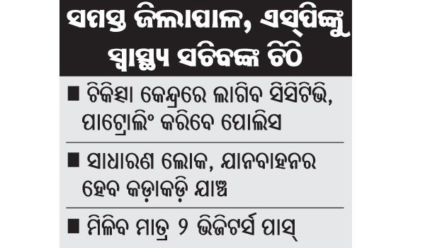 ସେହିପରି ଚିକିତ୍ସାଳୟ ପରିସରରେ ସୁରକ୍ଷା କର୍ମଚାରୀମାନେ ନିୟମିତ ପାଟ୍ରୋଲିଂ କରିବା ସହିତ ଅଯଥାରେ ପାର୍କିଂ ହୋଇଥିବା ଯାନକୁ ବାହାରକରିବା ସହ ଉଠାଦୋକାନକୁ ଉଚ୍ଛେଦ କରାଯିବ। ଅଭିଯୋଗ ଶୁଣାଣି ପାଇଁ ନିର୍ଦ୍ଦିଷ୍ଟ ବ୍ୟବସ୍ଥା ରହିବ। ଏହାଦ୍ୱାରା ସ୍ବାସ୍ଥ୍ୟକେନ୍ଦ୍ରର ମୁଖ୍ୟଙ୍କ ନିକଟରେ ସାଧାରଣ ଲୋକ ସହଜରେ ନିଜର ଅଭିଯୋଗ ଦାଖଲ କରିପାରିବେ। ଯଦି ଅଭିଯୋଗ ଶୁଣାଣି ବ୍ୟବସ୍ଥା ଠିକ୍ ରହିବ ତେବେ ଚିକିତ୍ସା ଅବହେଳା କିମ୍ବା ଅନ୍ୟାନ୍ୟ ବିଷୟ ନେଇ କେହି ବିଶୃଙ୍ଖଳା ସୃଷ୍ଟି କରିପାରିବେ ନାହିଁ। ଡାକ୍ତର ଏବଂ ସ୍ବାସ୍ଥ୍ୟକର୍ମୀଙ୍କୁ ଆକ୍ରମଣ ଘଟଣାଗୁଡ଼ିକ ସ୍ଥାନୀୟ ଏସ୍ପି ଗୁରୁତର ଭାବେ ନେବା ସହ ଆଇନ ଅନୁଯାୟୀ କାର୍ଯ୍ୟାନୁଷ୍ଠାନ ଗ୍ରହଣ କରିବାକୁ ଚିଠିରେ ଉଲ୍ଲେଖ କରାଯାଇଛି।