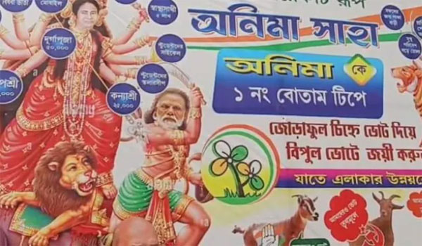 ପୋଷ୍ଟରରେ ମମତା ବାନାର୍ଜୀଙ୍କୁ ଦେବୀ ଦୁର୍ଗା ଭାବେ ଦର୍ଶାଯାଇଥିବା ବେଳେ ପ୍ରଧାନମନ୍ତ୍ରୀ ମୋଦି ଏବଂ କେନ୍ଦ୍ର ଗୃହ ମନ୍ତ୍ରୀ ଅମିତ୍ ଶାହାଙ୍କୁ ମହିଷାସୁର ଭାବେ ଦର୍ଶାଯାଇଛି। ସେହିପରି ପୋଷ୍ଟରରେ ରାଜ୍ୟର ବିରୋଧୀ ଦଳକୁ ଛେଳି ଭାବେ ଦର୍ଶାଯାଇଛି। ଏଥିରେ ଲେଖା ଅଛିି, ଯଦି କେହି ବିରୋଧୀ ଦଳକୁ ଭୋଟ ଦେବ, ତାଙ୍କର ବଳି ପକାଯିବ।
