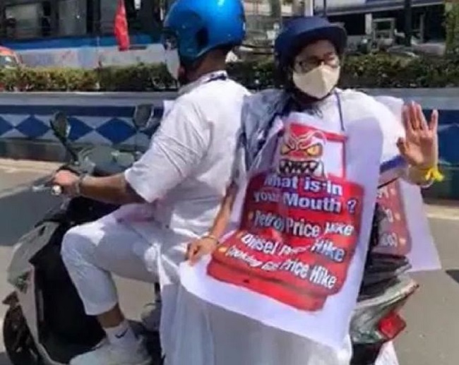 କୋଲକାତା,୨୫ ।୨: ଦେଶରେ ବେଳକୁ ବେଳ ବଢି ଚାଲିଛି ପ୍ରେଟ୍ରୋଲ, ଡିଜେଲ ଓ ରନ୍ଧନ ଗ୍ୟାସର ଦାମ୍ । ଏହାର ପ୍ରତିବାଦରେ ବିରୋଧୀ ଲଗାତାର ବିରୋଧ ପ୍ରଦର୍ଶନ କରି ଆସୁଛନ୍ତି । ଏହି ରାଜନୈତିକ ଦଳ ମଧ୍ୟରେ କଂଗ୍ରେସ, ସମାଜବାଦୀ ପାର୍ଟି, ବହୁଜନ ସମାଜ ପାର୍ଟି ସାମିଲ ଥିବା ବେଳେ ଏବେ ପଶ୍ଚିମବଙ୍ଗର ତୃଣମୂଳ କଂଗ୍ରେସ ବି ଏଥିରେ ସାମିଲ ହୋଇଛି । ଗୁରୁବାର ପଶ୍ଚିମବଙ୍ଗ ମୁଖ୍ୟମନ୍ତ୍ରୀ ମମତା ବାନାର୍ଜୀ ତୈଳ ଦର ବୃଦ୍ଧି ପ୍ରତିବାଦରେ ଇ-ସ୍କୁଟରରେ ରାଲିରେ ବାହାରିଥିବା ଦେଖାଯାଇଛି । ଏହି ସମୟରେ ସ୍କୁଟରରେ ଜଣଙ୍କ ପଛରେ ବସିଥିବା ବେଳେ ଦରବୃଦ୍ଧିର ଏକ ପୋଷ୍ଟର ବି ପିନ୍ଧିଥିବା ଦେଖାଯାଇଛି । ସୂଚନାଯୋଗ୍ୟ, ଗତ ପ୍ରାୟ ଏକ ମାସ ମଧ୍ୟରେ ବାରମ୍ବାର ତୈଳ ଦର ବୃଦ୍ଧି ଘଟି ଏବେ ପେଟ୍ରୋଲ ଲିଟର ପିଛି ପ୍ରାୟ ଶହେ ଟଙ୍କା ଛୁଇଁବାକୁ ଗଲାଣି । ଯାହା ସାଧାରଣ ଖାଉଟି ପାଇଁ ଚିନ୍ତାର କାରଣ ପାଲଟି ଥିବା ବେଳେ ଏବେ ପଡୋଶୀ ଦେଶ ନେପାଳରୁ ତେଲ ଚୋରା କାରବାର ହେଉଥିବା ଜଣାପଡିଛି ।
