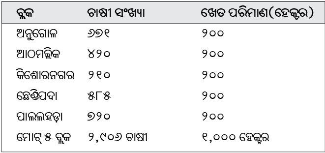 ଅନୁଗୋଳ ଜିଲାରେ ମାଣ୍ଡିଆ ଚାଷ ନୂଆ ନୁହେଁ। ୩୫ ବର୍ଷ ପୂର୍ବରୁ ଏହି ଗଡ଼ଜାତ ଅଞ୍ଚଳ ମିଲେଟ୍ ବେଲ୍ଟ ଭାବେ ଜଣାଶୁଣା ଥିଲା। ହେଲେ ସବୁଜ ବିପ୍ଳବ ସମୟରେ ଧାନକୁ ପ୍ରାଧାନ୍ୟ ଦିଆଯିବାରୁ ମାଣ୍ଡିଆ ଧୀରେ ଧୀରେ ଏଠାକାର ଚାଷୀଙ୍କ ଖେତରୁ ଦୂରେଇ ଯାଇଥିଲା। ଏବେ ମାଣ୍ଡିଆ ପ୍ରତି ପୁଣି ଚାହିଦା ବଢ଼ୁଥିବା ଦେଖି ଅନୁଗୋଳ ଜିଲାରେ ଏହି ଚାଷ ପାଇଁ ପ୍ରଶାସନ ଅଣ୍ଟା ଭିଡ଼ିଛି। ଜିଲା ଖଣିଜ ପ୍ରତିଷ୍ଠାନ ଓ ଜିଲା ପ୍ରଶାସନ ପକ୍ଷରୁ ଏଥିପାଇଁ ଓଡ଼ିଶା ସରକାରଙ୍କଠାରୁ ଆବଶ୍ୟକ ଅନୁମତି ଅଣାଯାଇସାରିଛି। ଜିଲାରେ ଏକ ପାଇଲଟ୍ ଷ୍ଟଡି ଓ ଚାଷୀଙ୍କ ଉତ୍ସାହ ଦେଖିବା ପରେ ୫ ବର୍ଷରେ ୩ ହଜାର ହେକ୍ଟରରେ ଚାଷ ପାଇଁ ଯୋଜନା କରାଯାଇଛି। ପ୍ରଥମ ବର୍ଷ ଖରିଫ ବେଳେ ୫ଟି ବ୍ଲକ ଅନୁଗୋଳ, ଆଠମଲ୍ଲିକ, କିଶୋରନଗର, ଛେଣ୍ଡିପଦା ଓ ପାଲଲହଡ଼ାର ୧୯୦ ହେକ୍ଟର ଲେଖାଏ ଜମିରେ ମାଣ୍ଡିଆ କରାଯିବ। ରବିବେଳେ ଅନ୍ୟ ୧୦ ଏକର ଲେଖାଏରେ ସୁଆଁ, କାଙ୍ଗୁ, ବାଜରା ପରୀକ୍ଷାମୂଳକ ଭାବେ ଚାଷ ହେବ। ଯଦି କାଙ୍ଗୁ, ସୁଆଁ ଓ ବାଜରାକୁ ସଫଳତା ମିଳେ ତା’ହେଲେ ଆସନ୍ତାବର୍ଷରେ ମାଣ୍ଡିଆ ସହ ମୁଖ୍ୟ ଫସଲରେ ଏହାକୁ ଯୋଡ଼ାଯିବ। ପାଲଲହଡ଼ାର ୨ଟି ପଞ୍ଚାୟତରେ ଏବେ ବି ମାଣ୍ଡିଆ ଚାଷ ହେଉଛି। ତେଣୁ ଜିଲାରେ ଏହି ମିଲେଟ୍ ମିସନ୍ ସଫଳତା ପାଇବାରେ ଅସୁବିଧା ରହିବ ନାହିଁ। ଆଗାମୀ ଦିନରେ ଅନ୍ୟ ୩ ବ୍ଲକରେ ମାଣ୍ଡିଆ ଚାଷ କରାଯିବ। ଅମଳ ପରେ ଚାଷୀମାନେ ୨୫ ପ୍ରତିଶତ ନିଜ ଖାଇବା ପାଇଁ ରଖିବେ। ଅବଶିଷ୍ଟ ୭୫ ପ୍ରତିଶତ ମାଣ୍ଡିଆ ପ୍ରଶାସନ ଜରିଆରେ ବିକ୍ରି ହେବ। ସ୍ବୟଂ ସହାୟକ ଗୋଷ୍ଠୀ ମାଧ୍ୟମରେ ମାଣ୍ଡିଆ ଚୂନା, କେକ୍, ଲଡ଼ୁ, ବିସ୍କୁଟ ଆଦି ପ୍ରସ୍ତୁତ କରାଯାଇ ସହର ଓ ଗ୍ରାମାଞ୍ଚଳରେ ବିକ୍ରି କରାଯିବ। ସ୍କୁଲ ଓ ଅଙ୍ଗନଓ୍ବାଡି ଖାଦ୍ୟ ତାଲିକାରେ ଏହାକୁ ସାମିଲ କରାଯିବ। ଆଗ୍ରହୀ ଚାଷୀଙ୍କ ନିକଟରେ ଏହି ଚାଷ ପହଞ୍ଚାଇବା ନିମନ୍ତେ ଜିଲା ପ୍ରଶାସନ ପକ୍ଷରୁ ଜିଲା ମୁଖ୍ୟ କୃଷି ଅଧିକାରୀ ନବକୃଷ୍ଣ ଚୌଧୁରୀ ସେଣ୍ଟର ଫର ଡେଭଲପ୍ମେଣ୍ଟ ଷ୍ଟଡିଜ୍ ଓ ୱାସନ୍ ଏନ୍ଜିଓ ସଂସ୍ଥା ସହ ଜାନୁୟାରୀ ମାସରେ ଚୁକ୍ତିନାମା ସ୍ବାକ୍ଷର କରିଛନ୍ତି। ଏହି ଚାଷକୁ କିଭଳି ବୀମାଭୁକ୍ତ କରାଯିବ ସେ ନେଇ ବିଚାରବିମର୍ଶ ଜାରି ରହିଥିବା ପ୍ରଶାସନ ପକ୍ଷରୁ କୁହାଯାଇଛି।