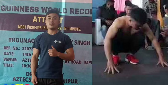 ଇମ୍ଫାଲ,୨୩।୧: ଆଙ୍ଗୁଠି ସହାୟତାରେ ଗୋଟିଏ ମିନିଟ୍ରେ ପୁଶ୍ ଅପ୍ସ ମାରିବାରେ ନୂଆ ଗିନିଜ ଓ୍ବାଲର୍ଡ ରେକର୍ଡ କରିଛନ୍ତି ମଣିପୁରର ଥୋଉନାଓଜାମ ନିରାଞ୍ଜୟ। ୨୪ ବର୍ଷୀୟ ଯୁବକ ଗୋଟିଏ ମିନିଟ୍ରେ ୧୦୯ ପୁଶ୍ ଅପ୍ସ ମାରି ଏହି ରେକର୍ଡ ସୃଷ୍ଟି କରିଛନ୍ତି।