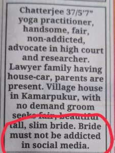 ନିତିନ୍ ସାଙ୍ଗଓ୍ବାନ ନାମକ ଜଣେ ଆଇଏଏସ ଅଧିକାରୀ ତାଙ୍କ ଟୁଇଟରରେ ଏକ ଖବରକାଗଜରେ ଛପା ଯାଇଥିବା ବବାହ ସମ୍ବନ୍ଧୀୟ ଏକ ବିଜ୍ଞାପନର ଫଟୋ ପୋଷ୍ଟ କରିଛନ୍ତି। ବିଜ୍ଞାପନରେ ଲେଖାଯାଇଛି ଯେ‘ କନ୍ୟାଟି ସୁନ୍ଦର, ଲମ୍ବା, ପତଳା ହେଉ କି ଯାହା ହେଉ ଏଥିରେ କିଛି ଯାଏ ଆସେ ନାହିଁ, କେବଳ ସୋସିଆଲ ମିଡିଆରେ ତାଙ୍କର ନିଶା ନ ଥାଉ।