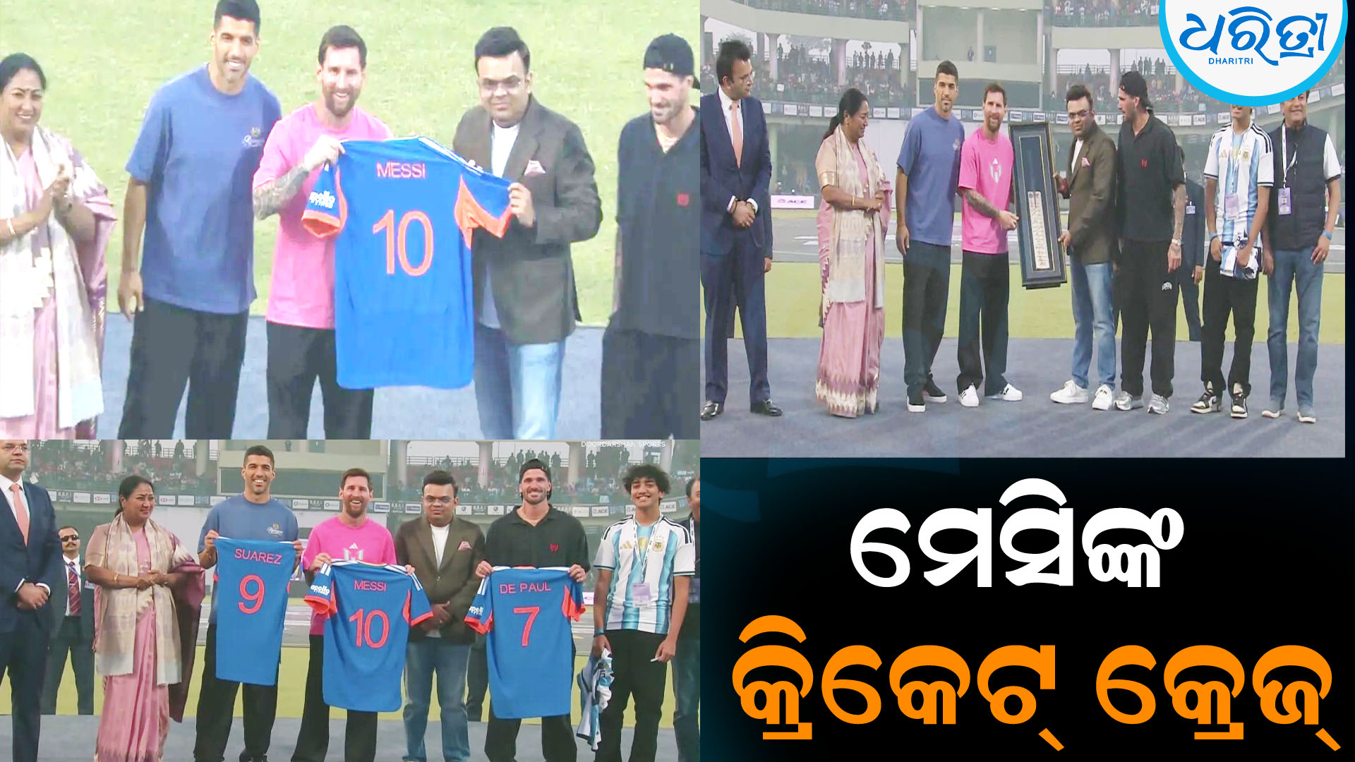 ନୂଆଦିଲ୍ଲୀ, ୧୫।୧୨: ଆର୍ଜେଣ୍ଟିନାର ଷ୍ଟାର ଫୁଟବଲ ଖେଳାଳି ଲିଓନେଲ ମେସି ତାଙ୍କ ଗୋଟ ଇଣ୍ଡିଆ ଟୁର୍ର ତୃତୀୟ ଦିନରେ ଦିଲ୍ଲୀରେ ପହଞ୍ଚିଛନ୍ତି। ଏହି କାର୍ଯ୍ୟକ୍ରମ ଦିଲ୍ଲୀର ଅରୁଣ ଜେଟଲି ଷ୍ଟାଡିୟମରେ ଅନୁଷ୍ଠିତ ହୋଇଥିଲା। ଆଇସିସି ସଭାପତି ଜୟ ଶାହା, ଡିଡିସିଏ ସଭାପତି ରୋହନ ଜେଟଲି ଏବଂ ଦିଲ୍ଲୀ ମୁଖ୍ୟମନ୍ତ୍ରୀ ରେଖା ଗୁପ୍ତା ଅରୁଣ ଜେଟଲି ଷ୍ଟାଡିୟମରେ ମେସିଙ୍କୁ ଭେଟିଥିଲେ। ଏହି କାର୍ଯ୍ୟକ୍ରମ ସମୟରେ ଜୟ ଶାହ ମେସି, ମୁଖ୍ୟମନ୍ତ୍ରୀ ରେଖା ଗୁପ୍ତା ଏବଂ ରୋହନ ଜେଟଲିଙ୍କୁ ଭାରତୀୟ କ୍ରିକେଟ ଦଳର ଜର୍ସି ପ୍ରଦାନ କରିଥିଲେ।