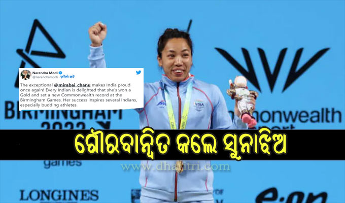ମୀରାବାଈଙ୍କ ଏହି ସଫଳତାକୁ ନେଇ ପ୍ରଧାନମନ୍ତ୍ରୀ ତାଙ୍କୁ ଶୁଭେଚ୍ଛା ଜଣାଇଛନ୍ତି। ଏଥିସହ ଟୁଇଟ୍ କରି କହିଛନ୍ତି, ଅସାଧାରଣ। ମୀରାବାଈ ଚାନୁ ଭାରତକୁ ପୁଣି ଥରେ ଗୌରବାନ୍ବିତ କରିଛନ୍ତି। ସେ ବର୍ମିଂହାମରେ ସ୍ବର୍ଣ୍ଣ ଜିତିବା ସହ ଏକ ନୂତନ କମନଓ୍ବେଲ୍ଥ ରେକର୍ଡ ମଧ୍ୟ ସ୍ଥାପନ କରିଛନ୍ତି। ତାଙ୍କର ଏହି ସଫଳତା ପ୍ରତିଟି ଭାରତୀୟ ଆଥଲେଟ୍ସଙ୍କୁ ପ୍ରେରଣା ଦେବ ବୋଲି ପ୍ରଧାନମନ୍ତ୍ରୀ କହିଛନ୍ତି।