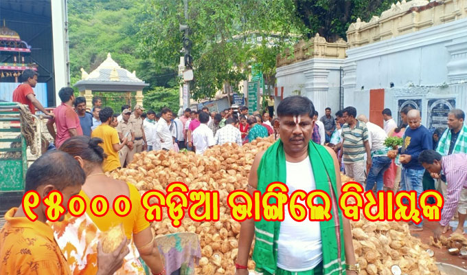 ପ୍ରକାଶ ଯୋଗ୍ୟ, ସୋରଡାରୁ ତିନିଥର ବିଜୁ ଜନତା ଦଳରୁ ପ୍ରାର୍ଥୀ ହୋଇ ବିଧାୟକ ହୋଇଥିବା ସ୍ବାଇଁ ପ୍ରଥମେ ୨୦୦୯ ନିର୍ବାଚନରେ ୪୦୧୧ ଭୋଟ ବ୍ୟବଧାନରେ ଜିତିଥିଲେ। ସେତେବେଳେ ସେ ସେଠାରେ ୪୧୦୦ ନଡିଆ ଭାଙ୍ଗିଥିଲେ । ପୁନର୍ବାର ୨୦୧୪ରେ ୧୬୦୦୦ ବ୍ୟବଧାନରେ ନିର୍ବାଚନ ଜିତିବା ପରେ ଅନୁରୂପ ନଡିଆ ଭାଙ୍ଗିଥିଲେ । ସେହିପରି ୨୦୧୯ ନିର୍ବାଚନରେ ୧୩,୯୯୬ ଭୋଟରେ ଜିତିଥିଲେ। ସେତେବେଳେ ୧୫୦୦୦ ନଡିଆ ଭାଙ୍ଗିବା ପାଇଁ ମାନସିକ ରଖିଥିଲେ। ତେବେ କୋଭିଡ କଟକଣା, ବାପାଙ୍କ ଦେହାନ୍ତ ଓ ଶ୍ରାଦ୍ଧବାର୍ଷିକୀ ଶେଷ ହେବା ପରେ ନୃସିଂହ ଚତୁର୍ଦ୍ଦଶୀରେ କାର୍ଯ୍ୟ ସମ୍ପନ୍ନ ପାଇଁ ସ୍ଥିର କରିଥିଲେ। ପୂର୍ବ ପ୍ରସ୍ତୁତି କ୍ରମେ ବୁଧବାର ସୋରଡ଼ା ନିର୍ବାଚନ ମଣ୍ଡଳୀର ବେଲଗୁଣ୍ଠା ଏନ୍ଏସି ଓ ବ୍ଲକ, ସୋରଡ଼ା ଏନ୍ଏସି ଓ ବ୍ଲକର ମୋଟ ୪୪ ପଞ୍ଚାୟତ ଓ ୨ ଟି ଏନ୍ଏସିରୁ ୧୦୦ରୁ ଊର୍ଦ୍ଧ୍ୱ ଗାଡ଼ିରେ ୬୦୦ରୁ ଅଧିକ ସମର୍ଥକ ସୋରଡ଼ାରେ ଏକତ୍ରିତ ହୋଇଥିଲେ। ବୁଧବାର ସମସ୍ତ ଗାଡି ସୀମାଞ୍ଚଳମ ଅଭିମୁଖେ ଯାତ୍ରା କରି ସେଠାରେ ଗୁରୁବାର ଭୋର ସମୟରେ ପହଞ୍ଚତ୍ଥିଲେ। ସାମୂହିକ ଭାବେ ଠାକୁର ଦର୍ଶନ କରିଥିଲେ। ଆନ୍ଧ୍ରପ୍ରଦେଶର ବିଭିନ୍ନ ଅଞ୍ଚଳରୁ ୧୫ ହଜାର ନଡ଼ିଆ କିଣାଯାଇଥିଲା। ସକାଳ ୮ଟାରେ ପ୍ରଥମେ ବିଧାୟକ ନଡିଆ ଭଙ୍ଗା ଆରମ୍ଭ କରିଥିଲେ । ପରେ ସମସ୍ତେ ମିଶି ଭାଙ୍ଗିଥିଲେ। ସେଠାରେ ଏମ୍ପି ପ୍ରମିଳା ବିଶୋୟୀ ଉପସ୍ଥିତ ଥିଲେ। ସୋରଡ଼ା ନିର୍ବାଚନ ମଣ୍ଡଳୀର ବେଲଗୁଣ୍ଠା ବ୍ଲକ ଅଧ୍ୟକ୍ଷ ପ୍ରଶାନ୍ତ ନାୟକ, ଏନ୍ଏସି ଅଧ୍ୟକ୍ଷ ଫିରୋଜ ସେଠୀ, ଜିଲା ପରିଷଦ ସଭ୍ୟ ବିଦ୍ୟା ବିଶୋୟୀ, ସୋରଡା ଏନ୍ଏସି ଅଧ୍ୟକ୍ଷ ଶିବ ଶଙ୍କର ପଣ୍ଡା, ଜିଲା ପରିଷଦ ରାଜେଶ ସାହୁ, ପ୍ରଫୁଲ୍ଲ ମହାଙ୍କୁଡ, ରାମ ଶବର, ସରପଞ୍ଚ ତ୍ରିଲୋଚନ ସାହୁ, ସମସ୍ତ କାଉନସିଲର, ଉପାଧ୍ୟକ୍ଷ, ସମିତିସଭ୍ୟ, ଦଳୀୟ ସଭାପତି ପ୍ରମୁଖ ସାମିଲ ହୋଇଥିଲେ।