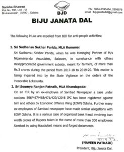 ସେହିପରି ବିଧାୟକ ସୁଧାଂଶୁ ପରିଡ଼ାଙ୍କୁ ଦଳରୁ ବହିଷ୍କାର କରାଯିବା ନେଇ ବିଜେଡି କାରଣ ଦର୍ଶାଇଛି। ସବ୍ସିଡି ସ୍କାମ୍ ମାମଲାରେ ସୁଧାଂଶୁଙ୍କୁ ବହିଷ୍କାର କରାଯାଇଥିବା ପ୍ରେସ୍ ରିଲିଜରେ ଉଲ୍ଲେଖ ରହିଛି। ସୁଧାଂଶୁ ଚାଷୀଙ୍କ ପାଇଁ ଉଦ୍ଦିଷ୍ଟ ସରକାରୀ ସବ୍ସିଡି ହଡ଼ପ କରିଥିବା ଅଭିଯୋଗ ହୋଇଥିଲା। ସୁଧାଂଶୁଙ୍କ ପରିଚାଳନାଧୀନ କମ୍ପାନୀ ୩ କୋଟି ଟଙ୍କା ହଡ଼ପ କରିଛି। ଲୋକପାଳଙ୍କ ନିର୍ଦ୍ଦେଶରେ ଭିଜିଲାନ୍ସ ଏହି ମାମଲାର ତଦନ୍ତ କରୁଛି।
