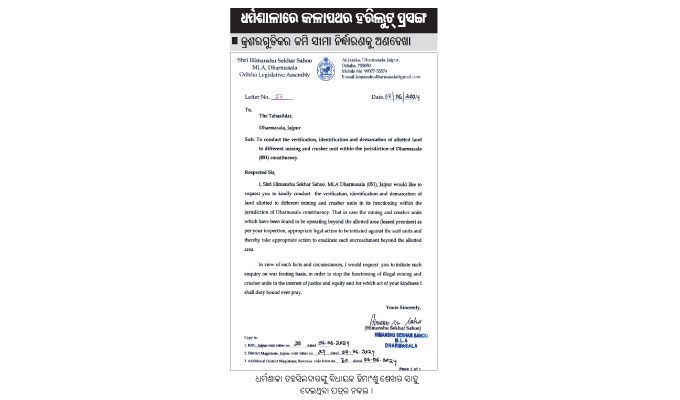 ଯାଜପୁର,୧୭।୭(ହର୍ଷବର୍ଦ୍ଧନ ବେହେରା) : ଯାଜପୁର ଜିଲାରେ ଲଘୁ ଖଣିଜ ଦ୍ରବ୍ୟ ହରିଲୁଟ ଓ ପୂର୍ବରୁ ନିର୍ଦ୍ଧାରିତ ଜରିମାନା ଆଦାୟ କ୍ଷେତ୍ରରେ ପଦକ୍ଷେପ ଆଶାନୁରୂପ ହେଉ ନ ଥିବା ଚର୍ଚ୍ଚା ହେଉଛି। ଏହାବାଦ୍ ଷ୍ଟୋନ କ୍ରଶରଗୁଡିକୁ ଅନୁମୋଦନଠାରୁ ବହୁ ଗୁଣ ଅଧିକ ଜମି ଦିଆଯାଇଥିବା ଅଭିଯୋଗ ହୋଇଥିବାବେଳେ ତା’ର ଚିହ୍ନଟ ଓ ସୀମା ନିର୍ଦ୍ଧାରଣ ଏଯାଏ ହୋଇ ପାରିନାହିଁ। ଏଥିପାଇଁ ଧର୍ମଶାଳା ତହସିଲଦାର ଓ ରାଜ୍ୟ ପ୍ରଦୂଷଣ ନିୟନ୍ତ୍ରଣ ବୋର୍ଡ(ଏସ୍ପିସିବି) କର୍ତ୍ତୃପକ୍ଷଙ୍କୁ ଭାଜପାର ସ୍ଥାନୀୟ ବିଧାୟକ ହିମାଂଶୁଶେଖର ସାହୁ ପ୍ରଦାନ କରିଥିବା ନିବେଦନ ପତ୍ରକୁ ଅଣଦେଖା କରାଯାଇଥିବା ବିଷୟ ପଦାକୁ ଆସିଛି।