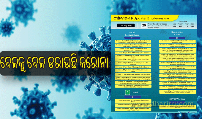 ଭୁବନେଶ୍ୱର,୭।୭(ବ୍ୟୁରୋ): ରାଜଧାନୀରୁ ମଙ୍ଗଳବାର ୨୯ଜଣ କରୋନା ପଜିଟିଭ୍ ଚିହ୍ନଟ ହୋଇଛନ୍ତି। ସେଥିରୁ ୧୪ ଲୋକାଲ କେସ୍, ୧୪ କ୍ୱାରାଣ୍ଟାଇନ୍ କେସ୍ ଏବଂ ଜଣେ ଜଣେ କୋଭିଡ୍ ଯୋଦ୍ଧା ରହିଛନ୍ତି। ନୂଆ ଆକ୍ରାନ୍ତଙ୍କୁ ମିଶାଇ ମୋଟ ଆକ୍ରାନ୍ତଙ୍କ ସଂଖ୍ୟା ୪୭୯ରେ ପହଞ୍ଚିଛି। ଏ ନେଇ ଭୁବନେଶ୍ୱର ମହାନଗର ନିଗମ(ବିଏମ୍ସି) ପକ୍ଷରୁ ଟୁଇଟ୍ କରି ସୂଚନା ଦିଆଯାଇଛି। ସେହିଭଳି ୩ଜଣ ସୁସ୍ଥ ହୋଇଥିବା ବିଏମ୍ସି ପକ୍ଷରୁ କୁହାଯାଇଛି।