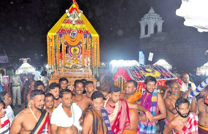 ପୁରୁଣା ଭୁବନେଶ୍ୱର,୨୫ା୫(ଡି.ଏନ୍.ଏ.): ଜ୍ୟେଷ୍ଠ ମାସ ଶୁକ୍ଲପକ୍ଷ ଷଷ୍ଠୀ ତିଥିରେ ପାରମ୍ପରିକ ଶୀତଳଷଷ୍ଠୀ ଯାତ୍ରା ଉପଲକ୍ଷେ ବୁଧବାର ପ୍ରଭୁ ଶ୍ରୀ ଲିଙ୍ଗରାଜ, ମା’ ପାର୍ବତୀ ଦେବ ଦମ୍ପତିଙ୍କ ବିବାହ କାର୍ଯ୍ୟ ପାରମ୍ପରିକ ନୀତି ଅନୁସାରେ ସମ୍ପନ୍ନ ହୋଇଛି। ଏହି କାର୍ଯ୍ୟ ଶ୍ରୀଲିଙ୍ଗରାଜଙ୍କ ଶ୍ୱଶୁରାଳୟ କେଦାରଗୌରୀ ମନ୍ଦିରରେ ଏକ ଆଧ୍ୟାମତ୍ିକ ପରିବେଶରେ ବିଳମ୍ବିତ ରାତିରେ ସମାପନ ହୋଇଛି। ଦୈନିକ ନୀତି ସନ୍ଧ୍ୟା ଧୂପ ପରେ ମା’ପାର୍ବତୀ ପ୍ରଭୁ ବାସୁଦେବଙ୍କ ସହ ପାଲିଙ୍କିରେ ଏବଂ ଶ୍ରୀ ଲିଙ୍ଗରାଜ ସୁସଜ୍ଜିତ ବିମାନରେ ବିରାଜମାନ କରିଥିଲେ। ଠାକୁରାଣୀ ସନ୍ଧ୍ୟା ଧୂପ ଓ ବଡ଼ ସିଂହାର ସରିବା ପରେ ପଞ୍ଚବକ୍ର ଆଳତି ହୋଇ ମନ୍ଦିର ପହଡ଼ ପଡ଼ିଥିଲା। ଏହାପରେ ମନ୍ଦିର ତରଫରୁ ବରଯାତ୍ରୀମାନଙ୍କୁ ମନ୍ଦିର ବେଢାରେ ମହାପ୍ରସାଦରେ ଆପାୟିତ କରାଯାଇଥିଲା। ରାତି ପ୍ରାୟ ୧୧ଟା ୨୦ମିନିଟ୍ରେ ଘଣ୍ଟ, ଘଣ୍ଟା, ତ୍ରାସ, ଛତ୍ରୀ, ମଶାଲ, ରୋଶଣିରେ ବରଯାତ୍ରୀମାନେ ଶ୍ରୀଲିଙ୍ଗରାଜଙ୍କ ଶ୍ୱଶୁରାଳୟ କେଦାର ଗୌରୀ ମନ୍ଦିର ଅଭିମୁଖେ ଯାତ୍ରା କରିଥିଲେ। ଶ୍ରୀ ଜୀଉମାନେ ମନ୍ଦରରେ ପହଞ୍ଚତ୍ବା ପରେ ମନ୍ଦିରର କୂଳ ପୁରୋହିତ ବାଟବରଣୀ କରିଥିଲେ। ପ୍ରଭୁ ଶ୍ରୀଲିଙ୍ଗରାଜ ବିବାହ ବେଦିରେ ବିରାଜମାନ କରିଥିଲେ। ଶ୍ରୀଲିଙ୍ଗରାଜଙ୍କ ତରଫରୁ ପୂଜାପଣ୍ଡା ସେବାୟତ କର୍ତ୍ତା ଏବଂ ମା’ ପାର୍ବତୀଙ୍କ ତରଫରୁ ମହାସୁଆର ସେବାୟତ କର୍ତ୍ତୀ ହୋଇ ମନ୍ଦିର କୂଳ ପୁରୋହିତ ମନୋରଞ୍ଜନ ଦାଶଙ୍କ ପୌରୋହିତ୍ୟରେ ବିବାହ କାର୍ଯ୍ୟ ସମ୍ପୂର୍ଣ୍ଣ କରାଯାଇଥିଲା। ବିବାହ କାର୍ଯ୍ୟ ସରିବା ପରେ ଶ୍ରୀଜୀଉମାନେ ଖଟୁଲିରେ ଅବସ୍ଥାନ କରିଥିଲେ। ଏଥିରେ ପ୍ରଭୁ ଶ୍ରୀଅନନ୍ତ ବାସୁଦେବ ମଧ୍ୟସ୍ଥତା କରିଥିଲେ। ପୂଜାପଣ୍ଡା ଓ ପତ୍ରୀ ସେବାୟତ ଦେବ ଦମ୍ପତିଙ୍କ ଉଭୟଙ୍କ ପକ୍ଷରୁ ସାତଥର କଉଡ଼ି ଖେଳ କରାଇଥିଲେ ଏବଂ ପଞ୍ଚ ଉପଚାରରେ ଶ୍ରୀ ଜୀଉଙ୍କୁ ମନ୍ଦିର ପର୍ବଯାତ୍ରା ବିଶୋଇଙ୍କ ଦ୍ୱାରା ଯୋଗାଇ ଦିଆଯାଇଥିବା ମାଣ୍ଡୁଅ ପିଠାକୁ ଭୋଗ ନୈବେଦ୍ୟ କରାଯାଇଥିଲା। ମନ୍ଦିର ପ୍ରଶାସନର ଅବହେଳା ନେଇ ଚଳିତ ବର୍ଷ ମଧ୍ୟ ଶ୍ରୀକପିଳନାଥ ଦେବ ବିବାହ କାର୍ଯ୍ୟରେ ଯୋଗଦେଇ ନ ଥିଲେ।