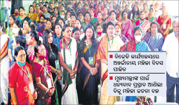 ଏହି ଅନ୍ତର୍ଜାତୀୟ ମହିଳା ଦିବସ ଅବସରରେ ବିଜୁ ମହିଳା ଜନତା ଦଳ ତରଫରୁ ବିଜେଡି ସଭାପତି ତଥା ମୁଖ୍ୟମନ୍ତ୍ରୀ ନବୀନ ପଟ୍ଟନାୟକଙ୍କୁ ୪ଟି ଧନ୍ୟବାଦ ପ୍ରସ୍ତାବ ସର୍ବସମ୍ମତି କ୍ରମେ ପାରିତ ହୋଇଛି।