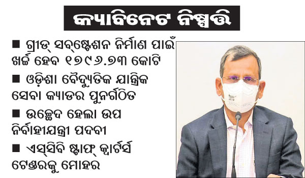ରାଜ୍ୟରେ ଗ୍ରୀଡ୍ ସବ୍ଷ୍ଟେଶନ, ପ୍ରାଇମେରୀ ସବ୍ଷ୍ଟେଶନ ଓ ବିଦ୍ୟୁତ୍ ଲାଇନର ସଦୁପଯୋଗ ନିମନ୍ତେ ଚିହ୍ନଟ ହୋଇଥିବା ଲୋଭୋଲଟେଜ ଅଞ୍ଚଳଗୁଡ଼ିକରେ ଅତିରିକ୍ତ ୩୩/୧୧ କେଭି ସବ୍ଷ୍ଟେଶନ ଏବଂ ସ୍ବତନ୍ତ୍ର ୩୩ କେଭି ସବ୍ଷ୍ଟେଶନ ନିର୍ମାଣ କରିବାକୁ ସରକାର ନିଷ୍ପତ୍ତି ନେଇଛନ୍ତି। ବିଦ୍ୟୁତ୍ ବଣ୍ଟନ କମ୍ପାନୀଗୁଡ଼ିକର ଲୋଡ୍କୁ ଆଧାର କରି ଓପିଟିସିଏଲ୍ ୧୭୯୬.୭୩ କୋଟି ଟଙ୍କା ବ୍ୟୟ ଅଟକଳରେ ୯୯ଟି ୩୩/୧୧ କେଭି ସବ୍ଷ୍ଟେଶନ ଏବଂ ୮୧୨.୦୫ କିମି ଦୀର୍ଘ ୬୪ଟି ସ୍ବତନ୍ତ୍ର ୩୩ କେଭି ଲାଇନ୍ ନିର୍ମାଣ କରିିବ। ଆସନ୍ତା ୩ ବର୍ଷ ମଧ୍ୟରେ ଏହା କାର୍ଯ୍ୟକ୍ଷମ ହେବ। ବିଦ୍ୟୁତ୍ ବିଭାଗ ପକ୍ଷରୁ ଦିଆଯାଇଥିବା ଏହି ପ୍ରସ୍ତାବକୁ କ୍ୟାବିନେଟ ମଞ୍ଜୁରୀ ମିଳିଛି। ଆଠମଲ୍ଲିକ, ଏମ୍-ରାମପୁର, ଚିତାଳୋ, ଆଗଲପୁର, ତୁମରୁରେ ଗ୍ରୀଡ୍ ସବେ୍ଷ୍ଟଶନ ହେବ। ସେହିପରି ତୁମୁଳଠାରୁ ଢେଙ୍କିକୋଟ ପର୍ଯ୍ୟନ୍ତ ୧୩୨ କେଭି ଲାଇନ ଟଣାଯିବ। ଲୋଭୋଲଟେଜ ସମସ୍ୟା ଦୂର ପାଇଁ ୨୬୦କୋଟି ଟଙ୍କାର ପ୍ରକଳ୍ପକୁ କ୍ୟାବିନେଟ ଅନୁମୋଦନ କରିଛନ୍ତି। ବିଦ୍ୟୁତ୍ ବଣ୍ଟନ ବ୍ୟବସ୍ଥାରେ ସୁଧାର ପାଇଁ ଖର୍ଚ୍ଚ ହେବ ୧୭ଶହ ୯୬କୋଟି ଟଙ୍କା।