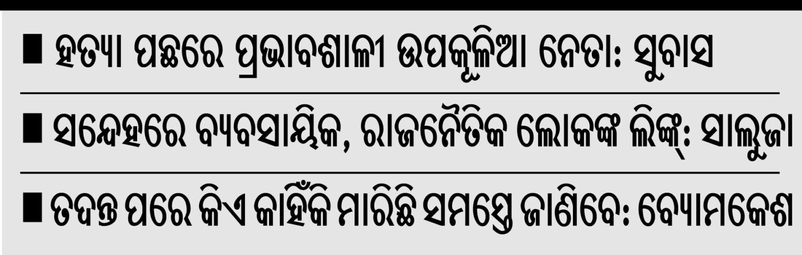 ଭୁବନେଶ୍ବର, ୭ା୨(ବ୍ୟୁରୋ):ପୂର୍ବତନ ମନ୍ତ୍ରୀ ନବ କିଶୋର ଦାସଙ୍କ ହତ୍ୟାକୁ ନେଇ ରାଜ୍ୟ ରାଜନୀତି ଏପଟ ସେପଟ ହୋଇଯାଇଛି। ମୁଖ୍ୟତଃ ଜଣେ କ୍ୟାବିନେଟ୍ ମନ୍ତ୍ରୀଙ୍କ ସୁରକ୍ଷା ଦାୟିତ୍ୱରେ ଆସିଥିବା ସ୍ଥାନୀୟ ଅଞ୍ଚଳର ଏଏସ୍ଆଇ ଗୁଳିକରି ହତ୍ୟା କରିବା କଥା ଅନେକଙ୍କୁ ଆଶ୍ଚର୍ଯ୍ୟ କରିଛି। ରାଜ୍ୟର ପ୍ରାୟ ସବୁ ନେତା, ମନ୍ତ୍ରୀ ମଧ୍ୟ ସୁରକ୍ଷା ବ୍ୟବସ୍ଥାକୁ ନେଇ ଭୟଭୀତ ଅବସ୍ଥାରେ ଅଛନ୍ତି। ନିଜ ନିଜର ସରକାରୀ ପିଏସ୍ଓଙ୍କୁ ଏବେ ନେତାମାନେ ବେଶି ମାତ୍ରାରେ ଡରିବାକୁ ଲାଗିଲେଣି। ତେବେ ଏହାରି ଭିତରେ ନବଙ୍କ ହତ୍ୟାକୁ ନେଇ ବିରୋଧୀ ପ୍ରତ୍ୟେକ ଦିନ ରାଜ୍ୟ ସରକାରଙ୍କ ବିରୋଧରେ ଅଭିଯୋଗ ଆଣିବାରେ ଲାଗିଛନ୍ତି। ତେବେ ସୋମବାର ଭାଜପା ବିଧାୟକ ସୁବାସ ପାଣିଗ୍ରାହୀ ଏକ ଗୁରୁତର ଅଭିଯୋଗ ଆଣିଥିବା ବେଳେ କଂଗ୍ରେସ ଘଟଣାର ତଦନ୍ତ ପ୍ରକ୍ରିୟାକୁ ନେଇ ପୁଣି ପ୍ରଶ୍ନ ଉଠାଇବା ସଙ୍ଗେ ସଙ୍ଗେ ଏସ୍ଆଇଟି ଦାବି କରିଛି। ଅନ୍ୟପଟେ ଏହି ଘଟଣା ପଛରେ କେଉଁ କାରଣ ରହିଛି ତାକୁ ନେଇ ରାଜ୍ୟବାସୀଙ୍କ ଭିତରେ ନାନାପ୍ରକାର ଚର୍ଚ୍ଚା ହେଉଥିବା ବେଳେ ବିରୋଧୀ କଂଗ୍ରେସ ଏବଂ ଭାଜପା କହିଛନ୍ତି ବ୍ୟବସାୟିକ କାରଣରୁ ରାଜନୈତିକ ଷଡ଼ଯନ୍ତ୍ର କରି ନବଙ୍କୁ ହତ୍ୟା କରାଯାଇଛି।