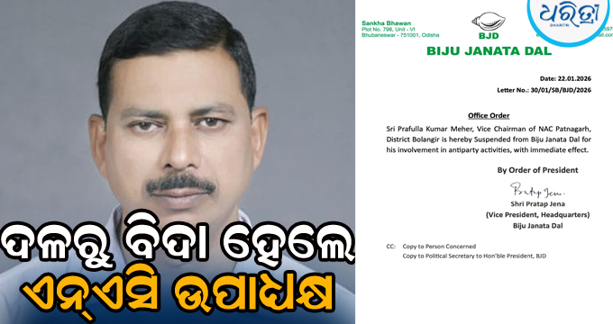 ପାଟଣାଗଡ଼,୨୩ା୧(ସଚ୍ଚିଦାନନ୍ଦ ମହାକୁର): ବଲାଙ୍ଗୀର ଜିଲା ପାଟଣାଗଡ଼ ଏନ୍ଏସି ଉପାଧ୍ୟକ୍ଷ ପ୍ରଫୁଲ୍ଲ କୁମାର ମେହେରଙ୍କୁ ଦଳ ବିରୋଧୀ କାର୍ଯ୍ୟ ଯୋଗୁ ବିଜୁ ଜନତା ଦଳ ପକ୍ଷରୁ ତାଙ୍କୁ ପତ୍ରସଂଖ୍ୟା ୩୦/୧/ଏସ୍ବି/ବିଜେଡି/୨୦୨୬ରେ ତାଙ୍କୁ ଦଳର ଉପସଭାପତି ପ୍ରତାପ ଜେନା ବହିଷ୍କୃତ କରିଛନ୍ତି।