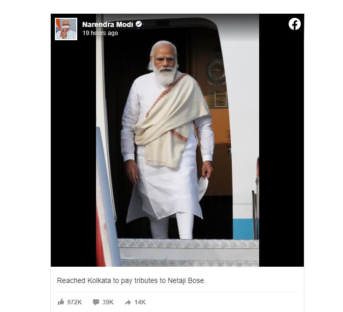 ‘ନେତାଜୀ ବୋସଙ୍କୁ ଶ୍ରଦ୍ଧାଞ୍ଜଳି ଦେବା ପାଇଁ କୋଲକାତାରେ ପହଞ୍ଚିଛି’ ବୋଲି କ୍ୟାପଶନରେ ଲେଖାଥିବା ଫଟୋକୁ ଗୋଟିଏ ଦିନରେ ୧ ନିୟୁତ ଲାଇକ୍ ମିଳିଛି। ୧୪ ହଜାର ୟୁଜର୍ସ ଶେୟାର କରିଥିବାବେଳେ ୪୭ ହଜାର କମେଣ୍ଟ ହୋଇଛି ଏହି ପୋଷ୍ଟରେ। ପ୍ରଧାନମନ୍ତ୍ରୀ ପ୍ରଥମେ ନେତାଜୀ ଭବନ ଯାଇଥିଲେ। ପରେ ପଶ୍ଚିମ ବଙ୍ଗ ମୁଖ୍ୟମନ୍ତ୍ରୀ ମମତା ବାନାର୍ଜୀଙ୍କ ସହ ଏକ ମଞ୍ଚରେ ନେତାଜୀଙ୍କୁ ଶ୍ରଦ୍ଧାଞ୍ଜଳି ଦେଇଥିଲେ।