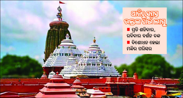ସେହିଭଳି ପୁରୀରେ ସଂକ୍ରମିତ ସଂଖ୍ୟା ବଢୁଥିବାରୁ ପ୍ରତି ଶନିବାର ଓ ରବିବାର ଶ୍ରୀମନ୍ଦିରର ଦର୍ଶନ ବନ୍ଦ କରାଯାଇ ବିଶୋଧନ କରାଯିବ ବୋଲି ପ୍ରଶାସନ ପକ୍ଷରୁ ନିଷ୍ପତ୍ତି ନିଆଯାଇଛି। ରବିବାର ମଧ୍ୟ ଭକ୍ତଙ୍କ ପ୍ରବେଶ ଓ ଦର୍ଶନ ବନ୍ଦ ରଖାଯାଇ ଶ୍ରୀମନ୍ଦିର ଭିତର ଓ ବାହାର ପରିସରକୁ ବିଶୋଧନ କରାଯାଇଥିଲା। ଭକ୍ତମାନେ ସିଂହଦ୍ୱାର ସମ୍ମୁଖ ବ୍ୟାରିକେଡ ନିକଟରୁ ପତିତପାବନଙ୍କୁ ଦର୍ଶନ କରି ଫେରିଥିଲେ। କେବଳ ସେବାୟତମାନେ ଶ୍ରୀମନ୍ଦିର ଭିତରକୁ ଯାଇ ମହାପ୍ରଭୁଙ୍କ ନୀତିକାନ୍ତି ସମ୍ପାଦନ କରିଥିଲେ। ଅଗ୍ନିଶମ ବାହିନୀ, ପୌର ସଂସ୍ଥା ଓ ଜିଲା ପ୍ରଶାସନ ପକ୍ଷରୁ ଶ୍ରୀମନ୍ଦିରର ଚାରିଦ୍ୱାର, ଜୋତା ଷ୍ଟାଣ୍ଡ, କିଓସ୍କ, ବ୍ୟାରିକେଡ ଓ ଅନ୍ୟାନ୍ୟ ସବୁ ସ୍ଥାନକୁ ବିଶୋଧନ କରାଯାଇଥିଲା।